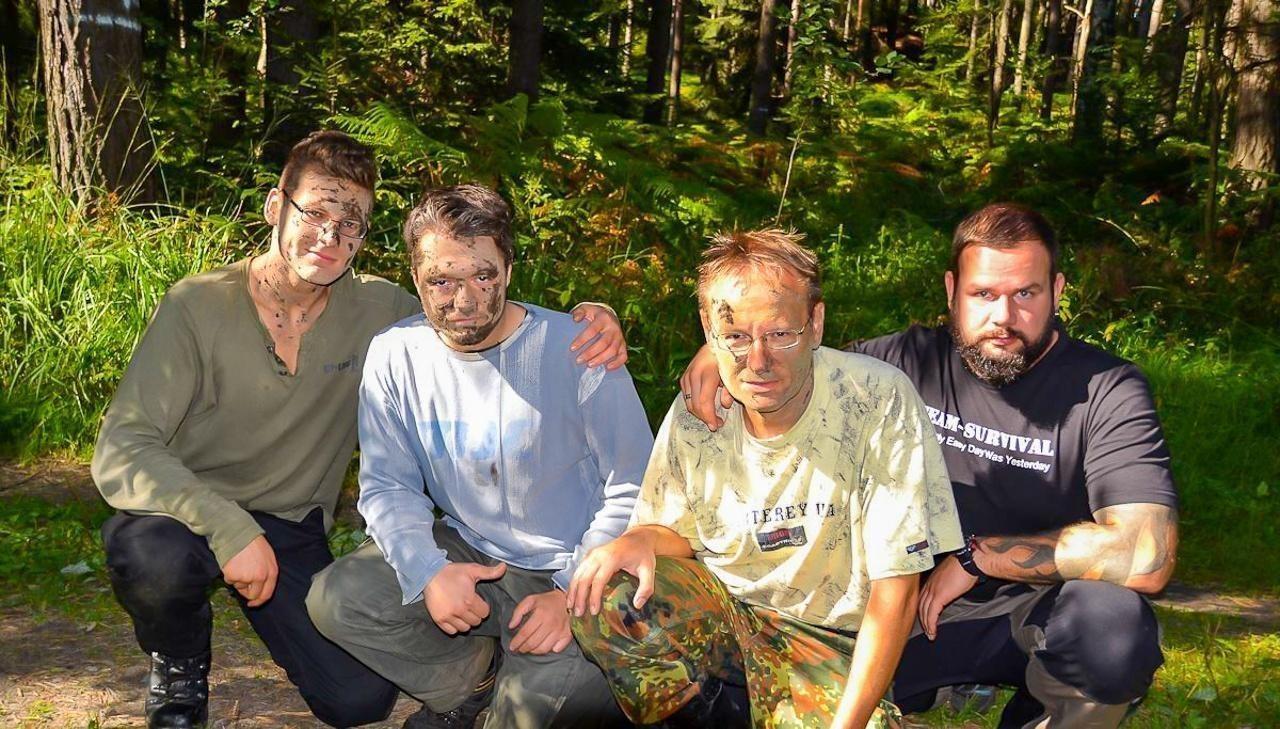 Vier Personen mit camouflierter Gesichtsbemalung posieren im Wald