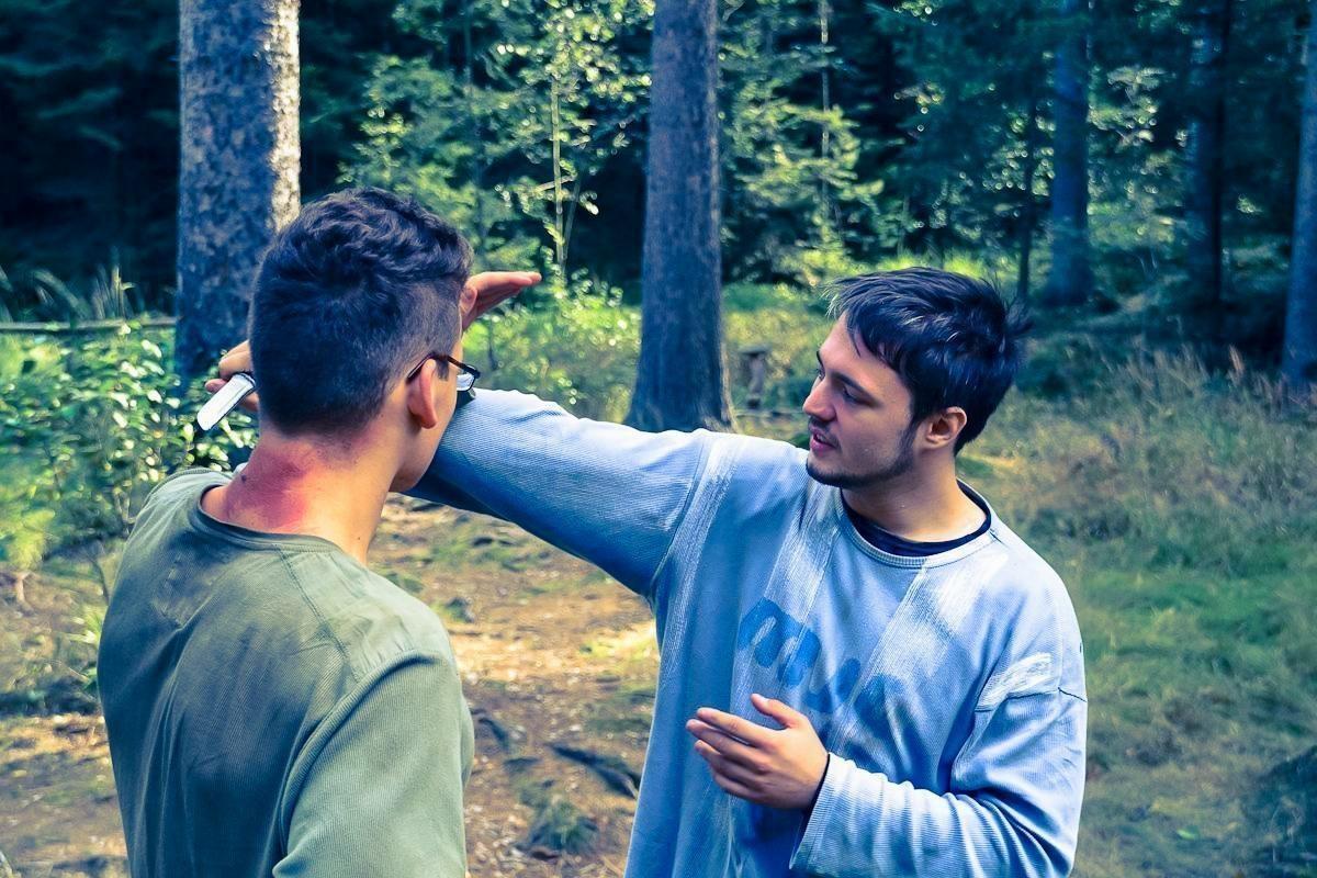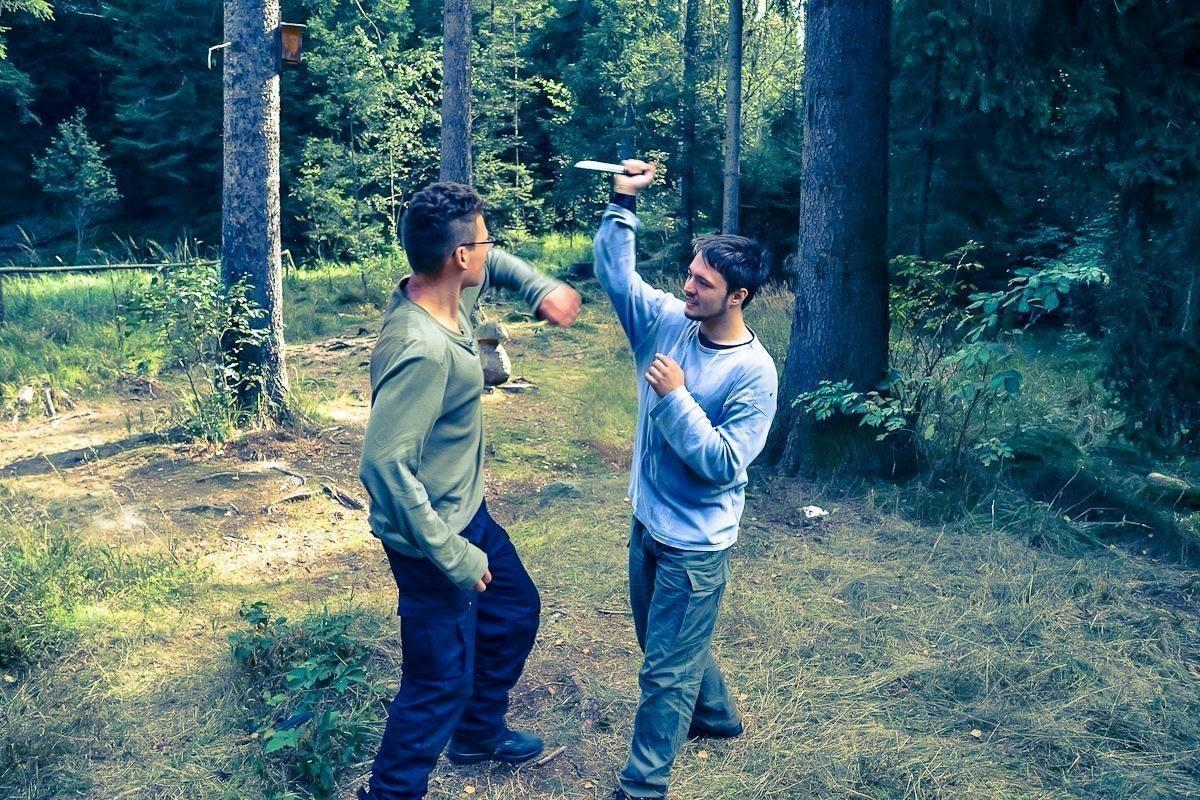 Zwei Personen üben eine Selbstverteidigungstechnik im Wald mit einem Messer