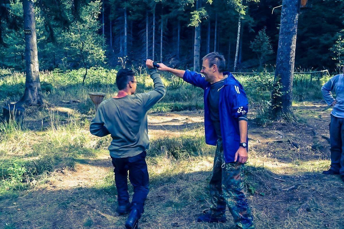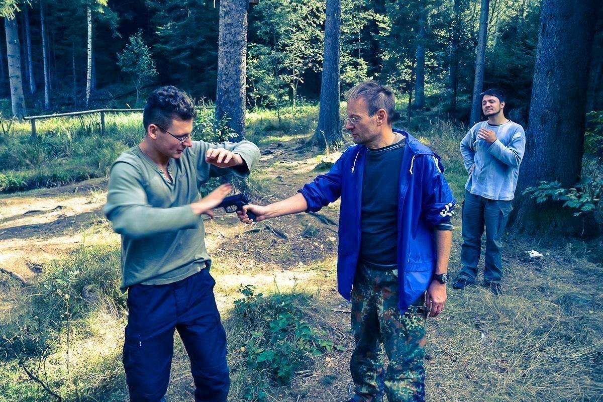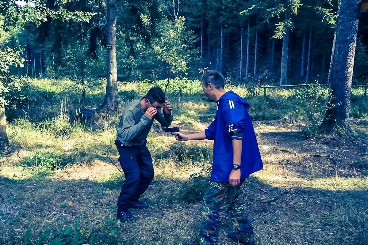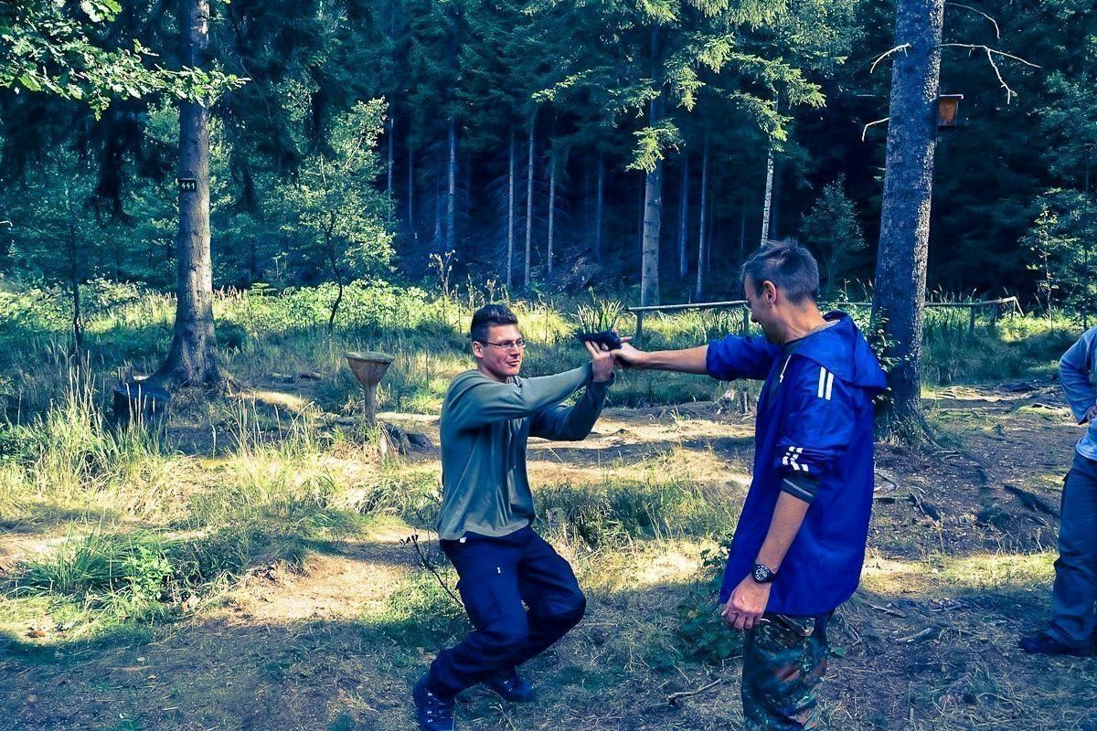 Zwei Personen üben eine Technik zur Handentwaffnung im Wald