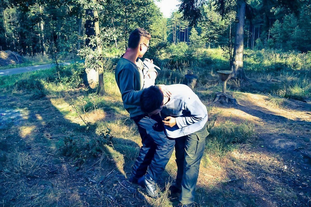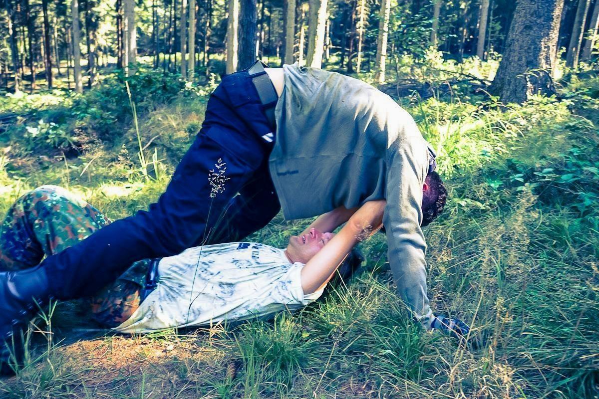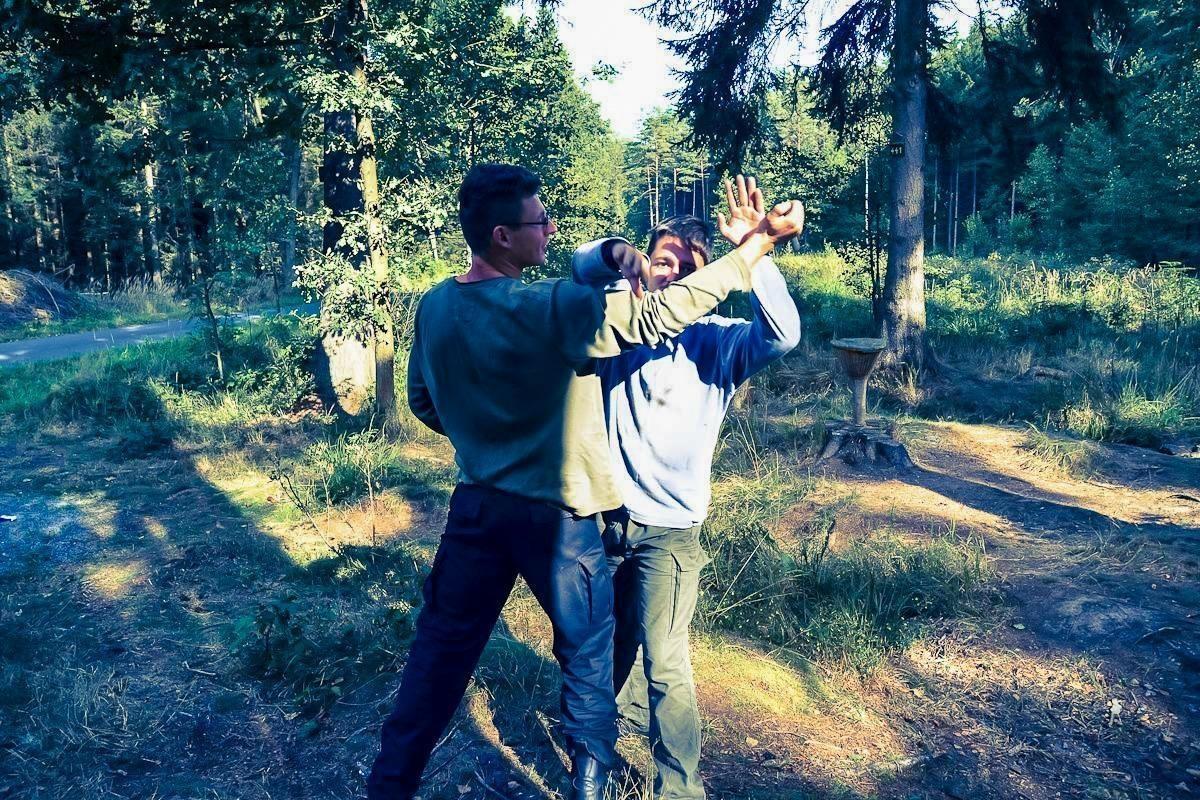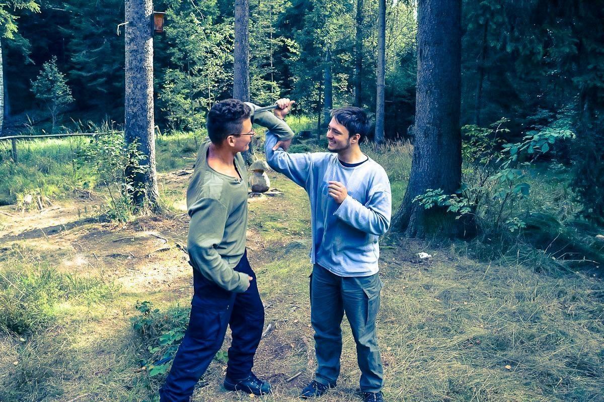 Zwei Personen üben eine Nahkampftechnik im Wald