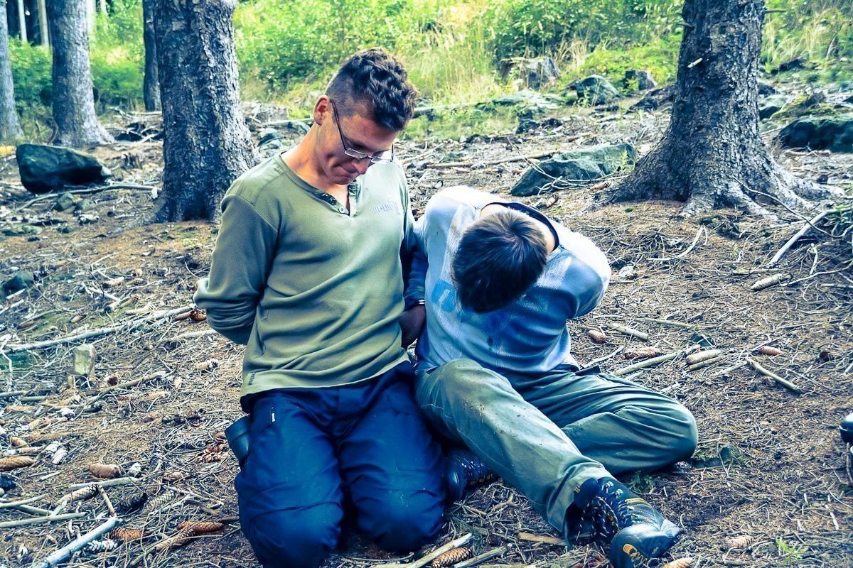 Zwei Personen in einem Wald, eine kniet auf dem Boden und hilft der anderen