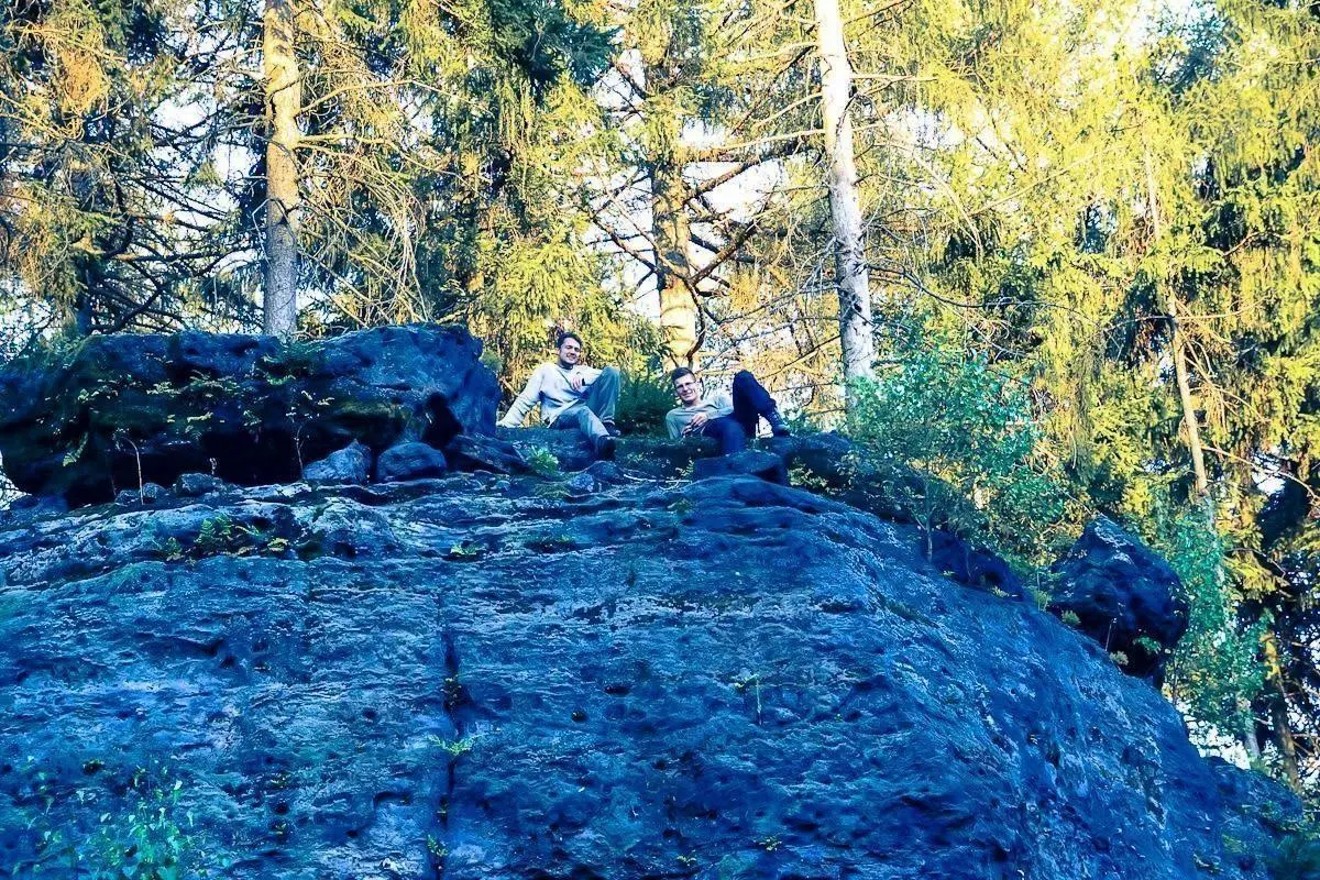 Zwei Personen sitzen auf einem großen Felsen umgeben von Bäumen