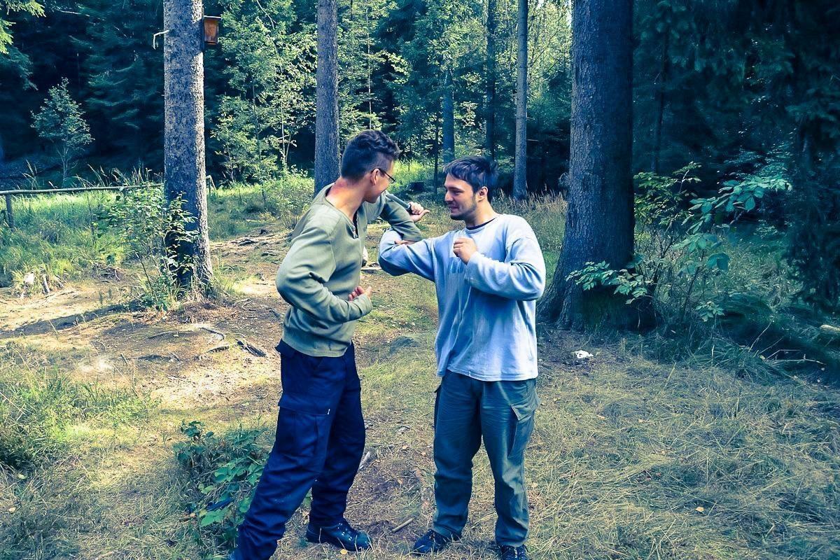 Zwei Personen stehen in einem Wald und üben eine Kampfsituation