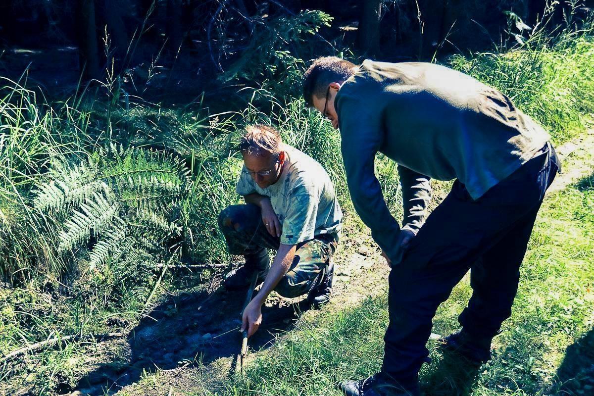Zwei Personen untersuchen den Boden am Rand eines kleinen Baches