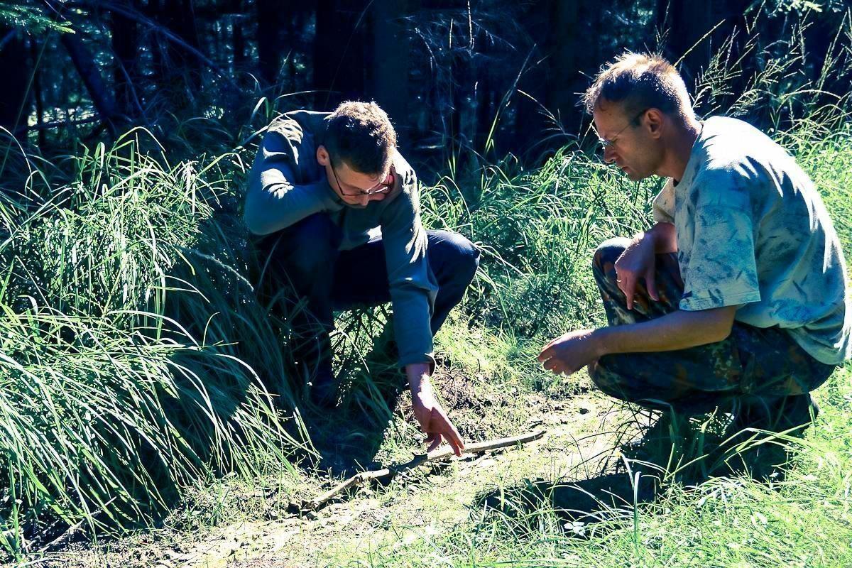 Zwei Personen knien im Wald und scheinen sich auf den Boden zu konzentrieren