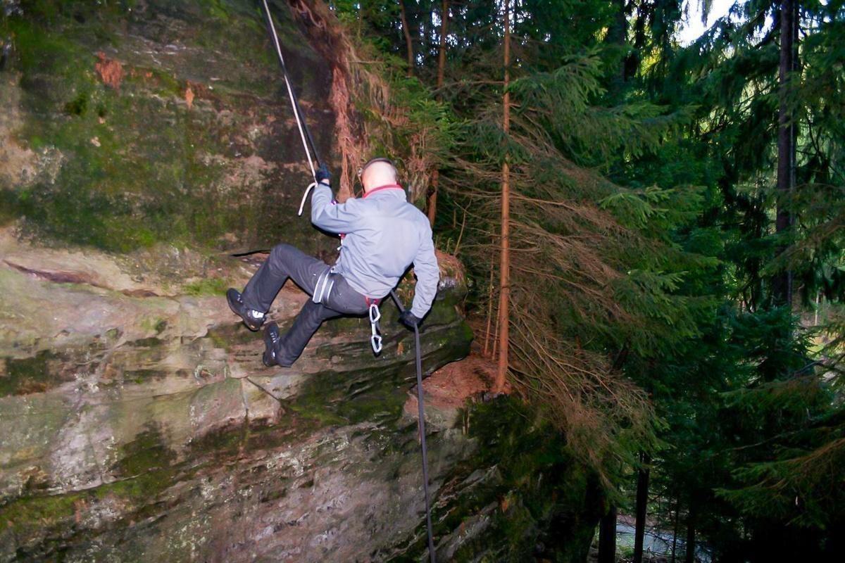 Seilquerung über einen Felsen im Wald mit Sicherungsgerät