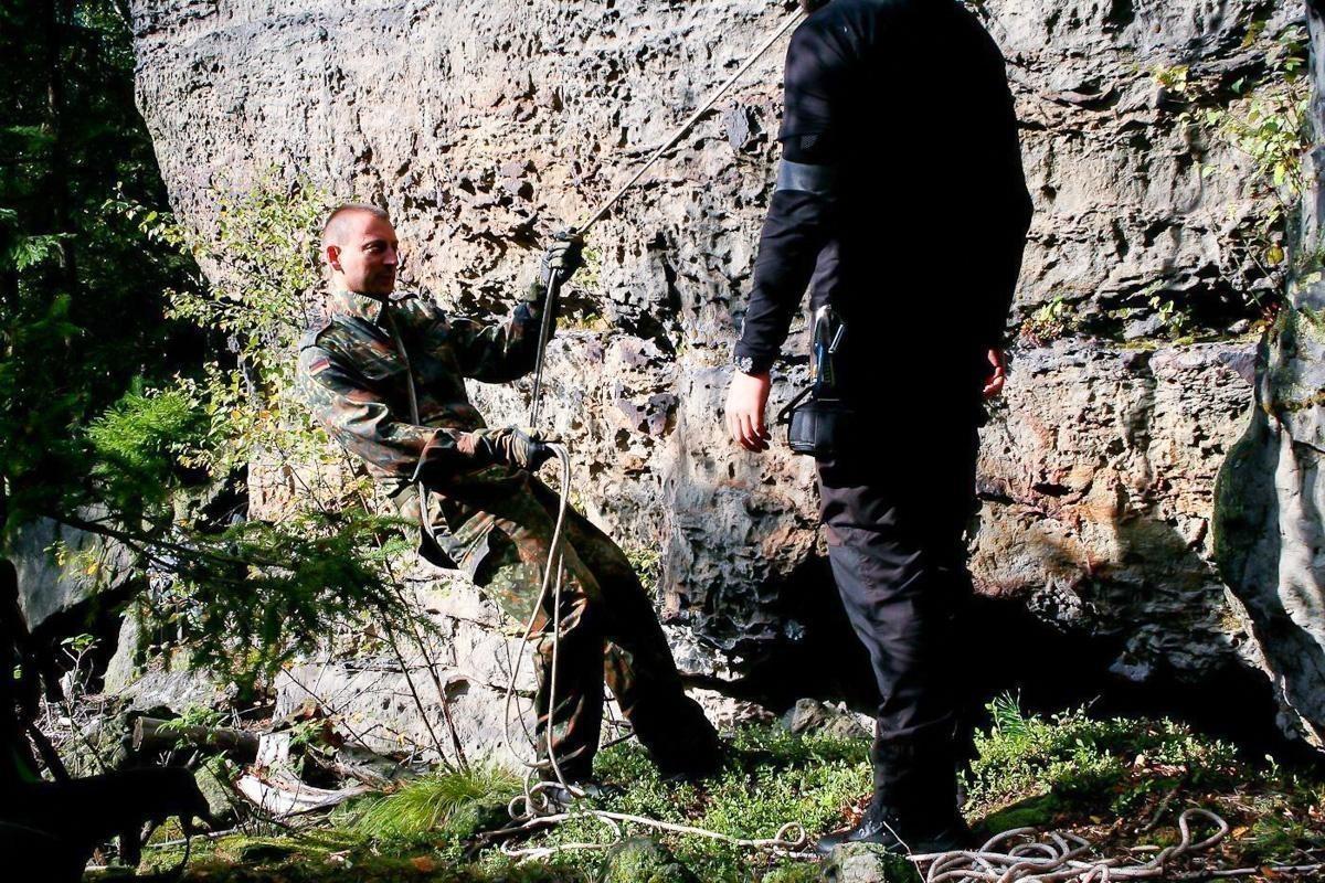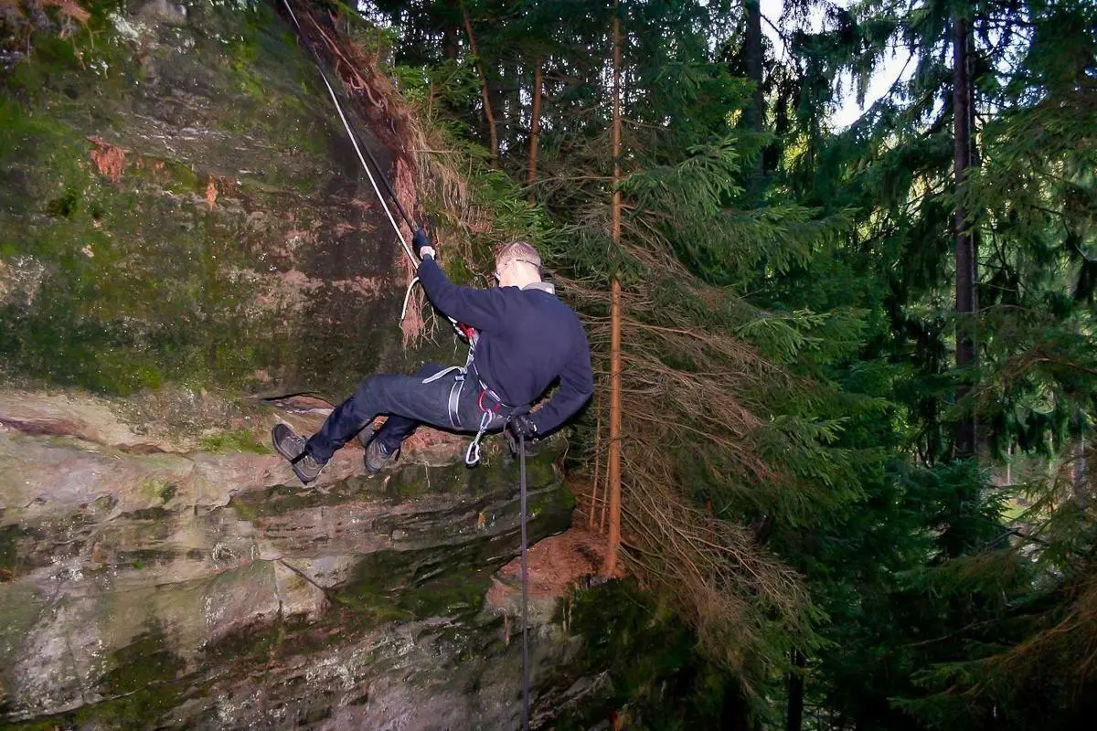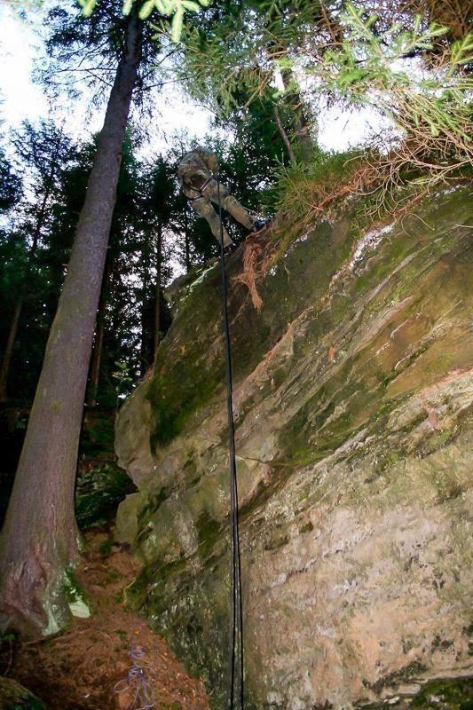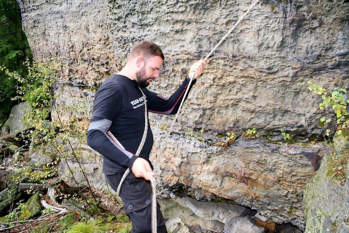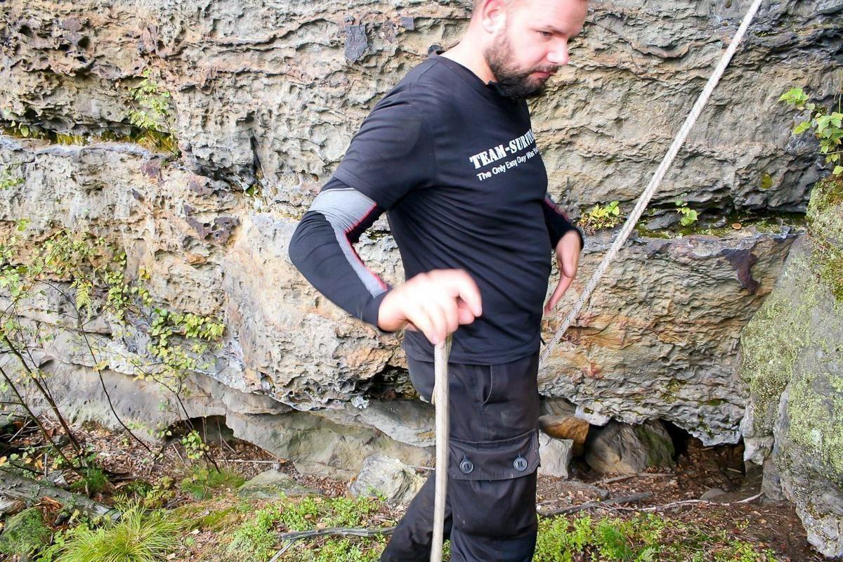 Kletterer sichert sich mit Seil an einer Felswand im Wald