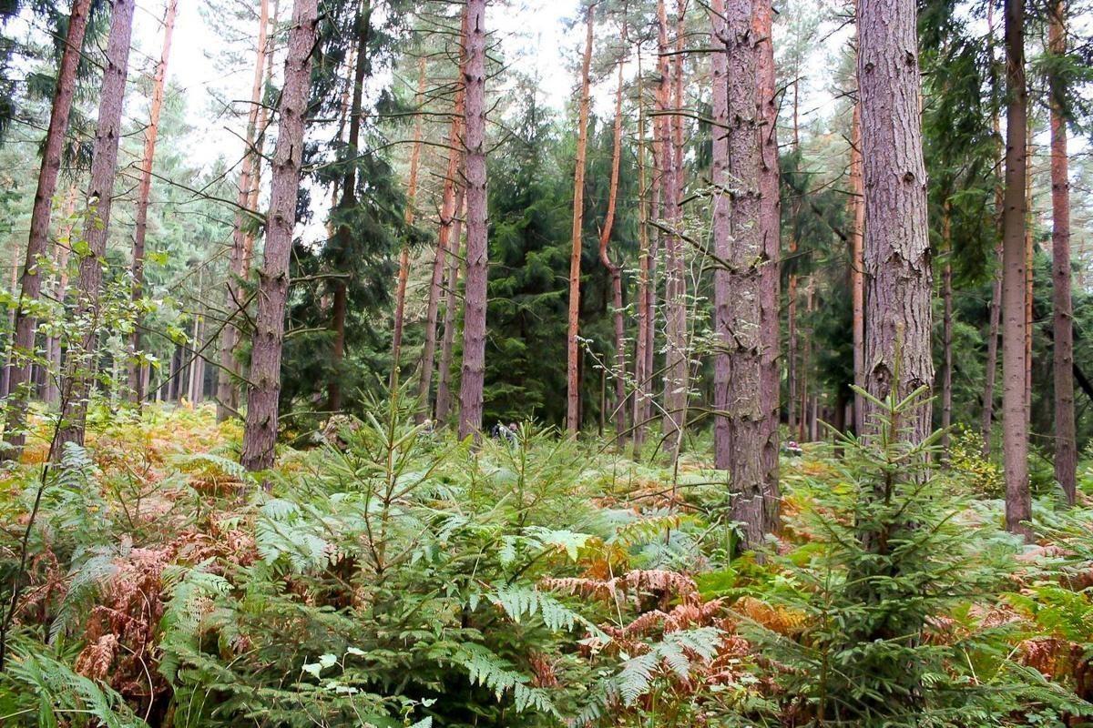 Dichte Baumreihe mit Farnen und trockenem Laub im Wald