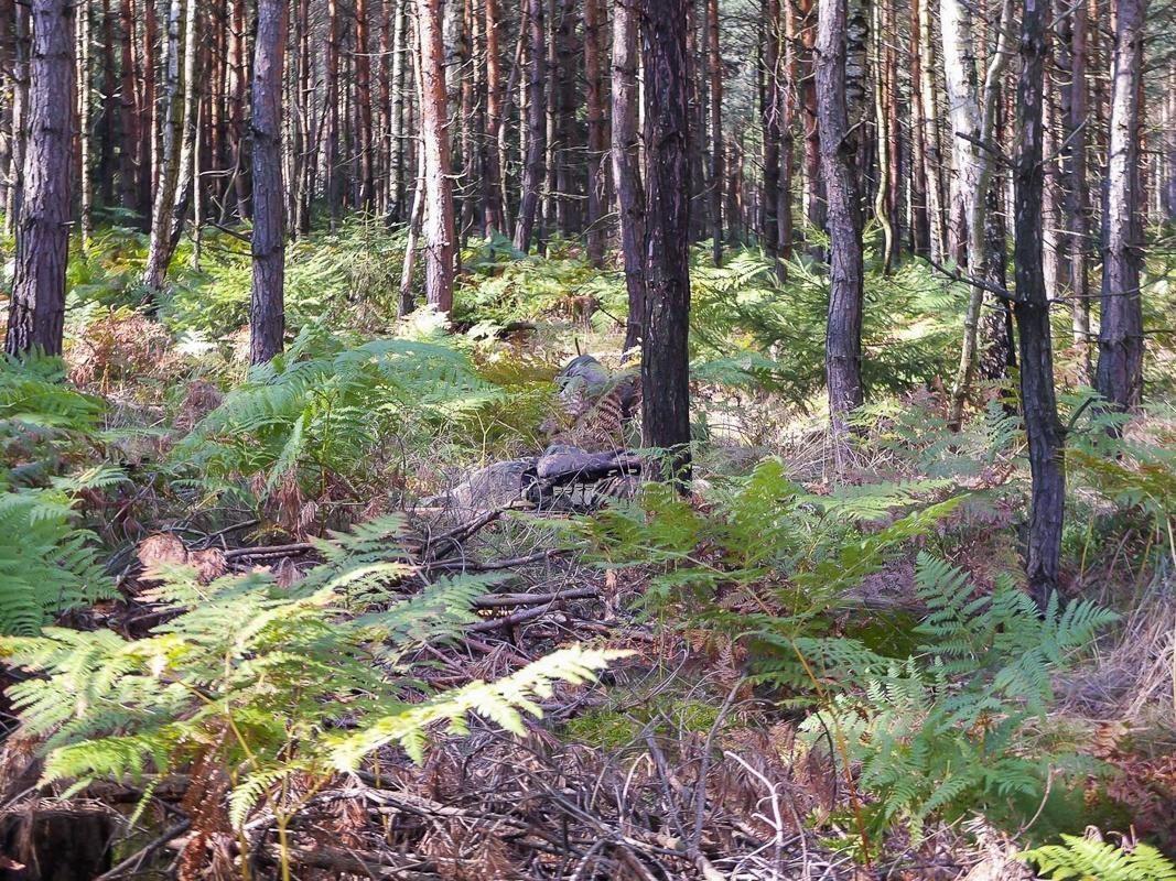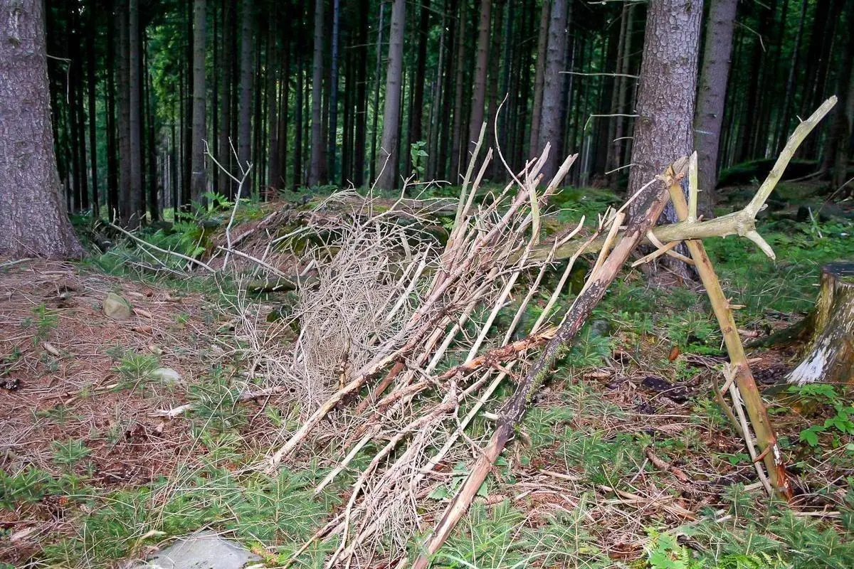 Selbstgebaute Deckung aus Farnen in einem Waldgebiet