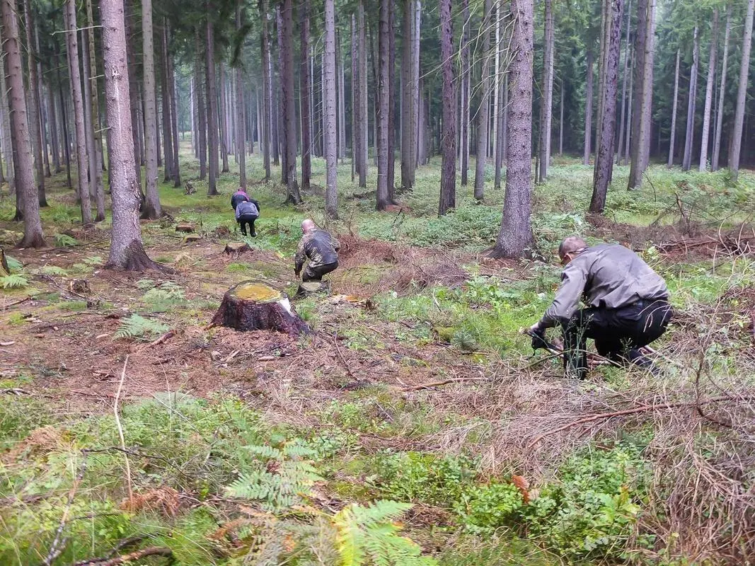 Drei Personen arbeiten im Wald, um Holz zu sammeln und den Boden zu reinigen