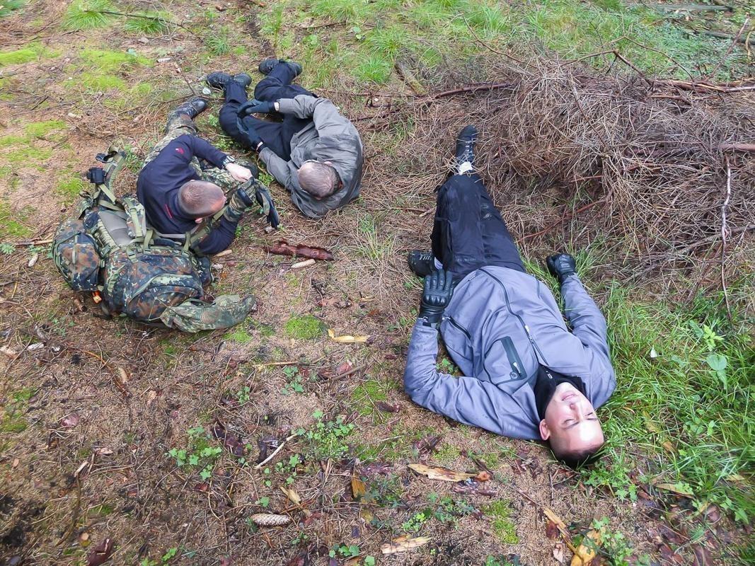 Drei Personen liegen auf dem Boden in einem bewaldeten Gebiet