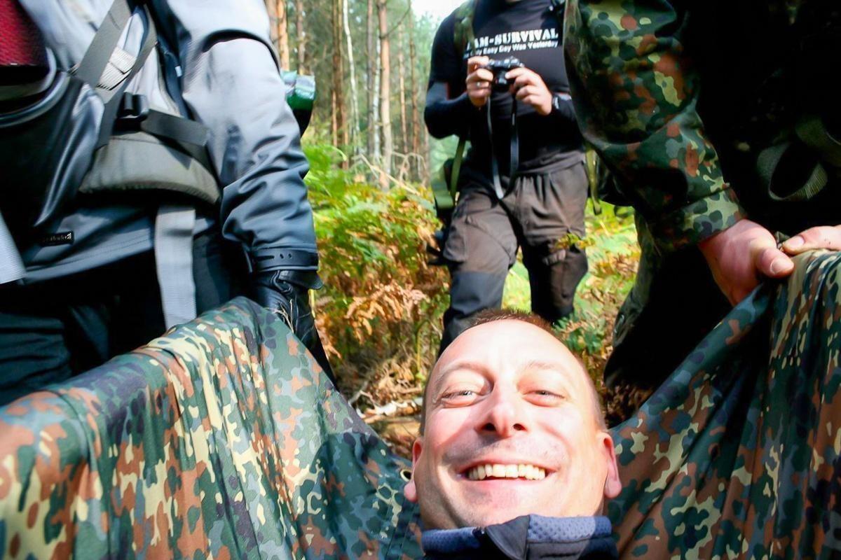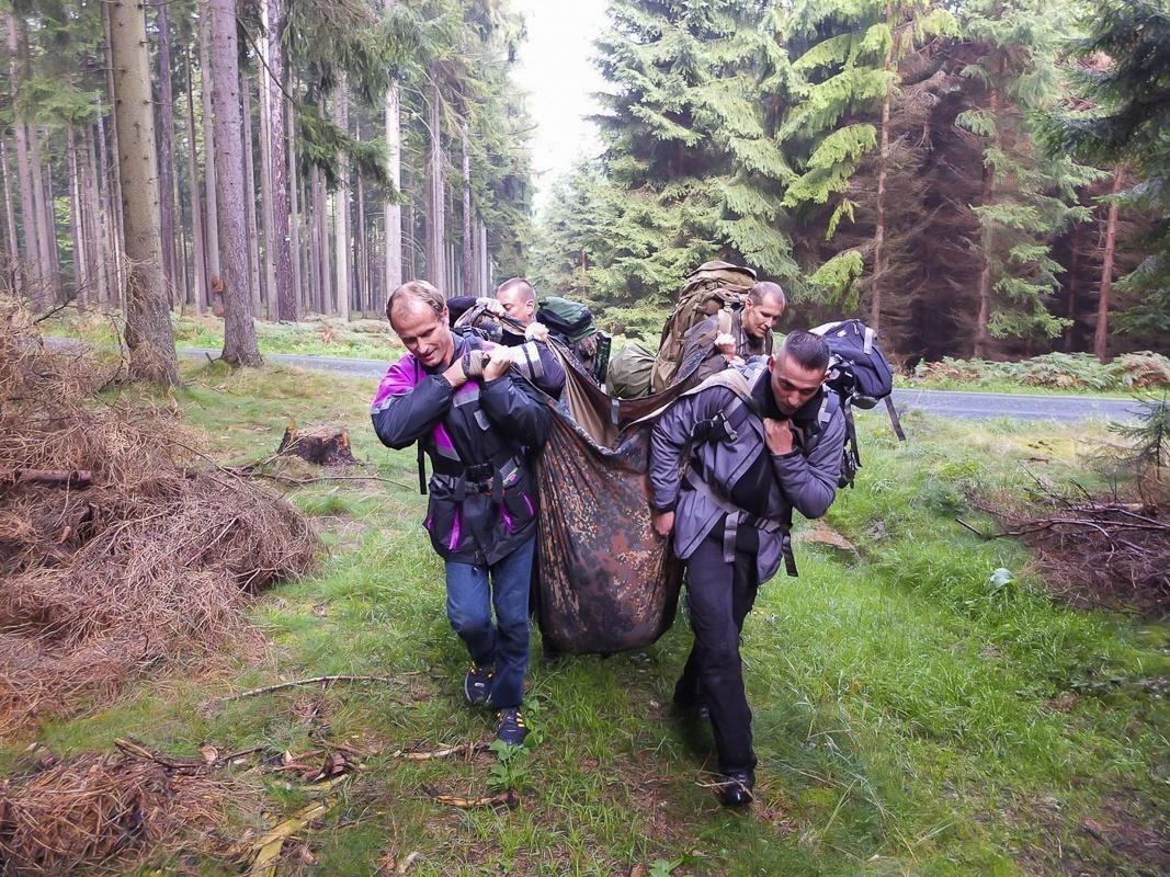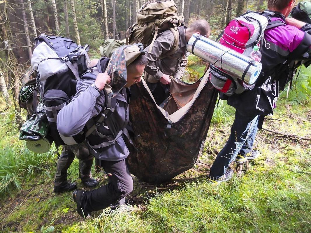 Vier Personen tragen eine improvisierte Trage durch den Wald