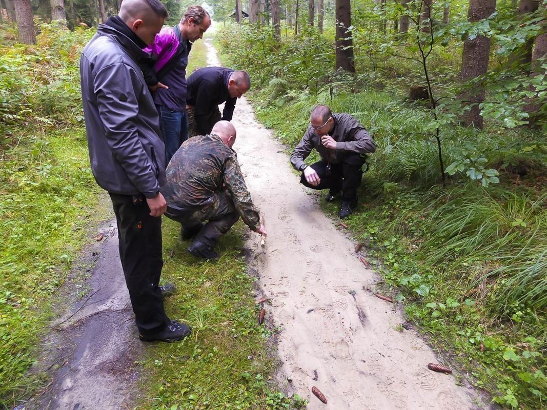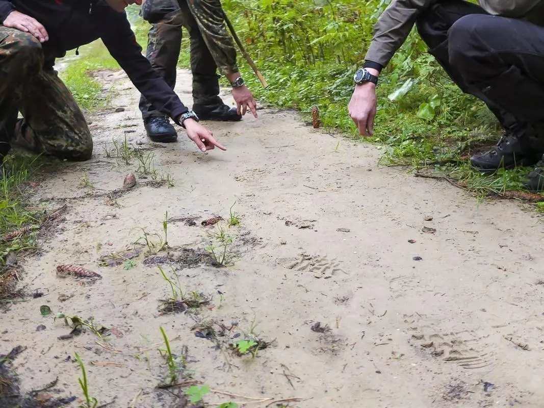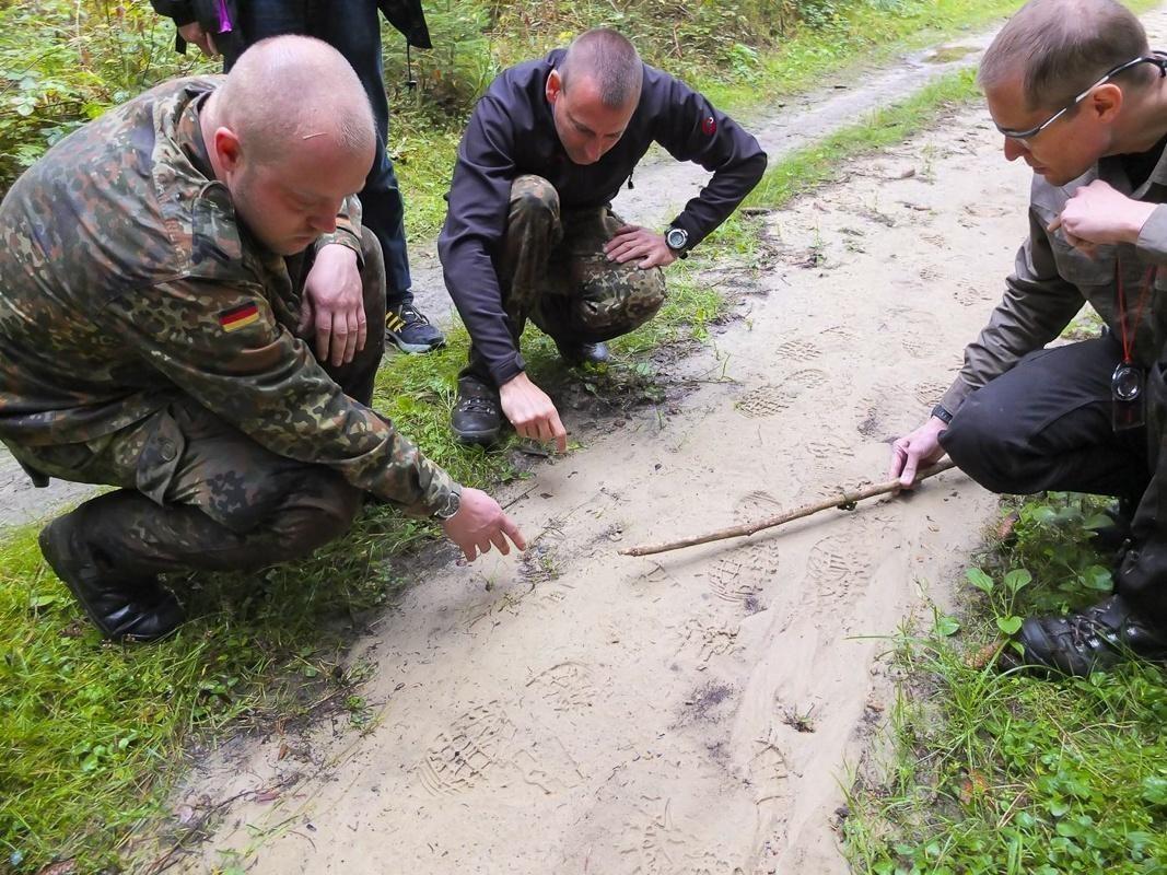 Fünf Personen betrachten Spuren im Sand auf einem Waldweg