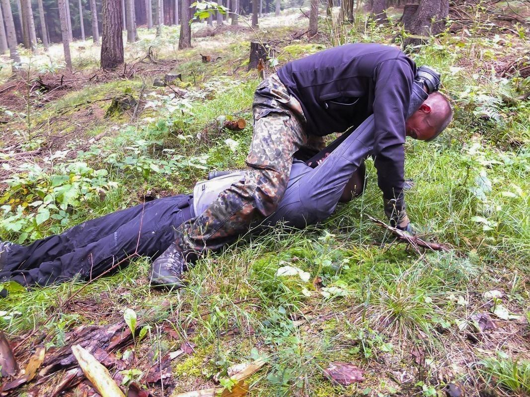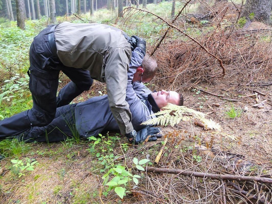 Zwei Personen im Wald, eine Person leistet Erste Hilfe auf dem Boden