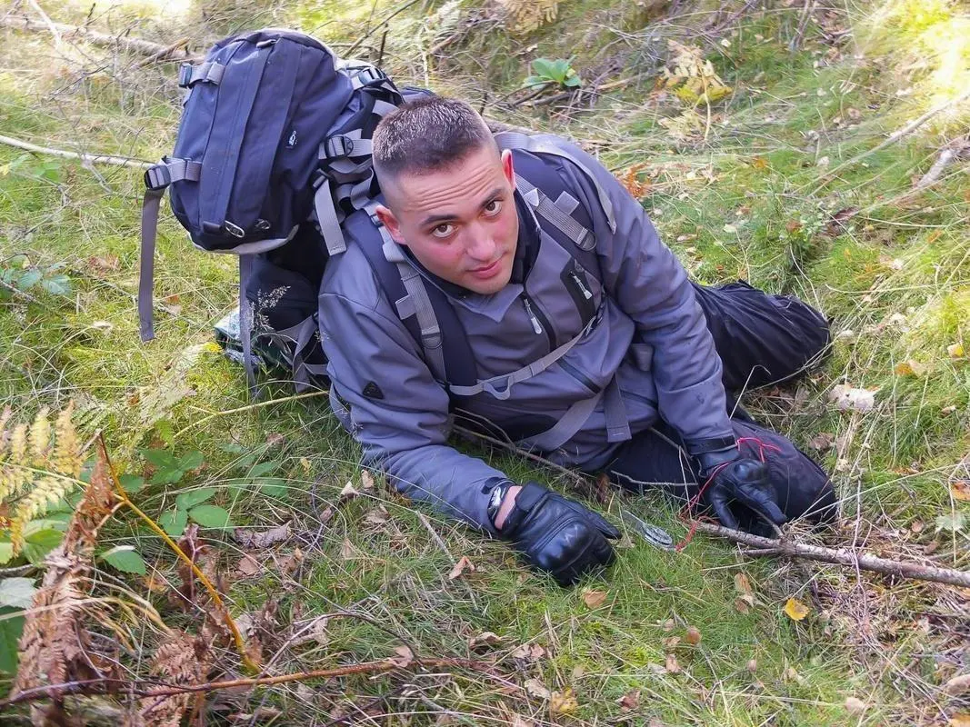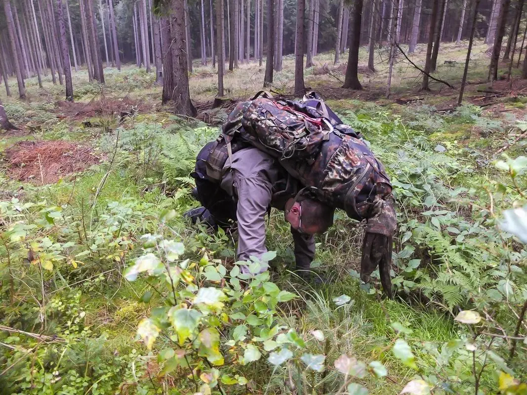 Mann in Tarnkleidung liegt am Boden und beobachtet den Waldboden