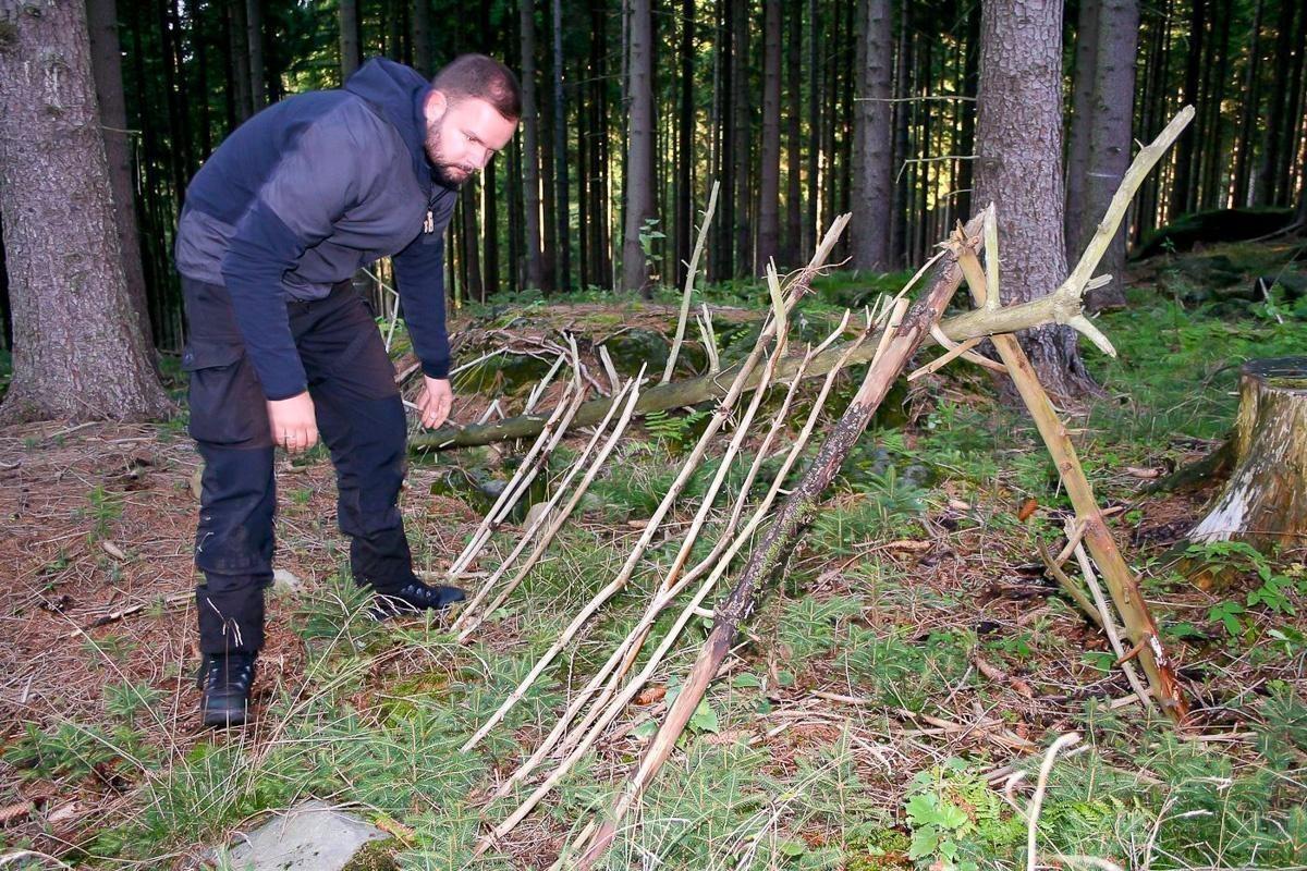 Mann überprüft eine selbstgebaute Konstruktion aus Ästen im Wald