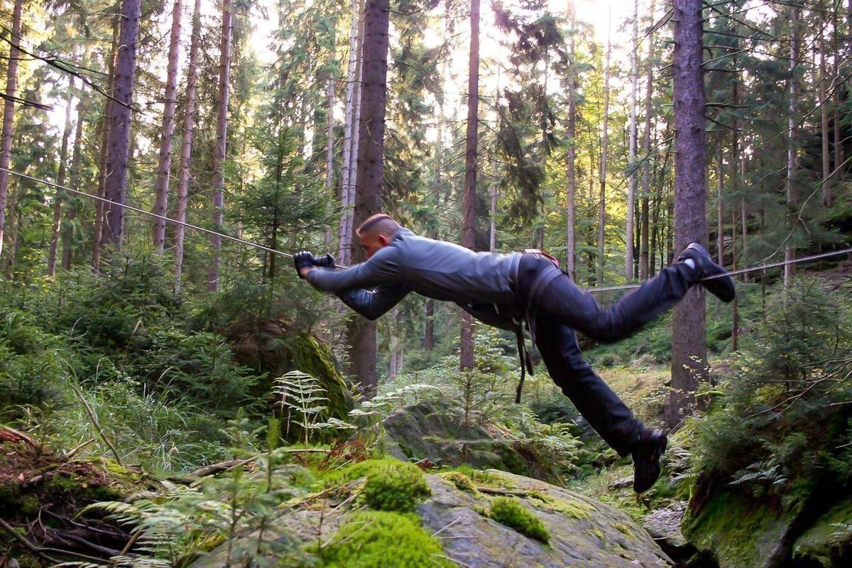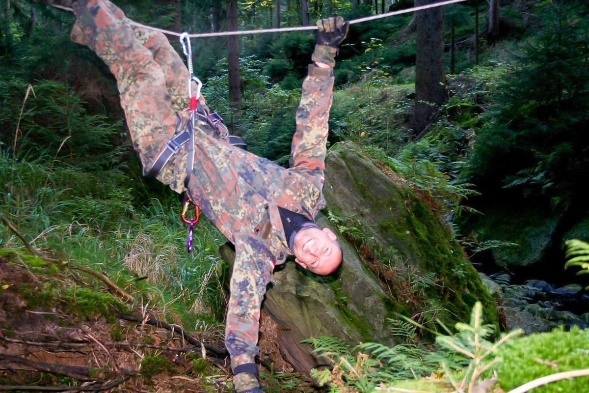 Selbstgebaute Seilquerung wird von einer Person in militärischer Ausrüstung überquert