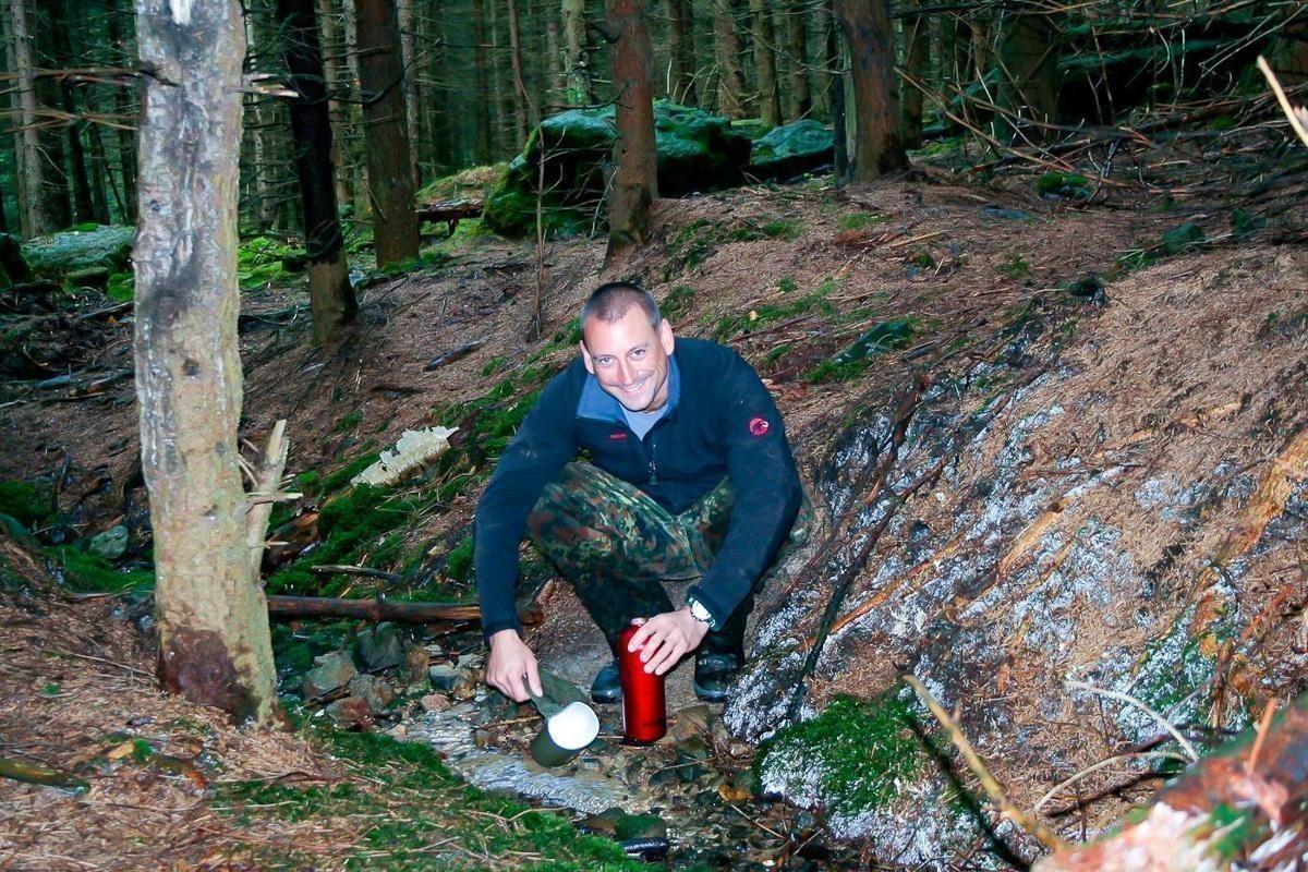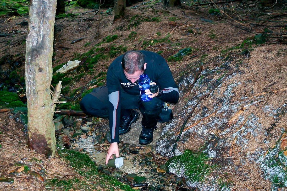 Person beugt sich über einen kleinen Bach und hält eine Wasserflasche in der Hand
