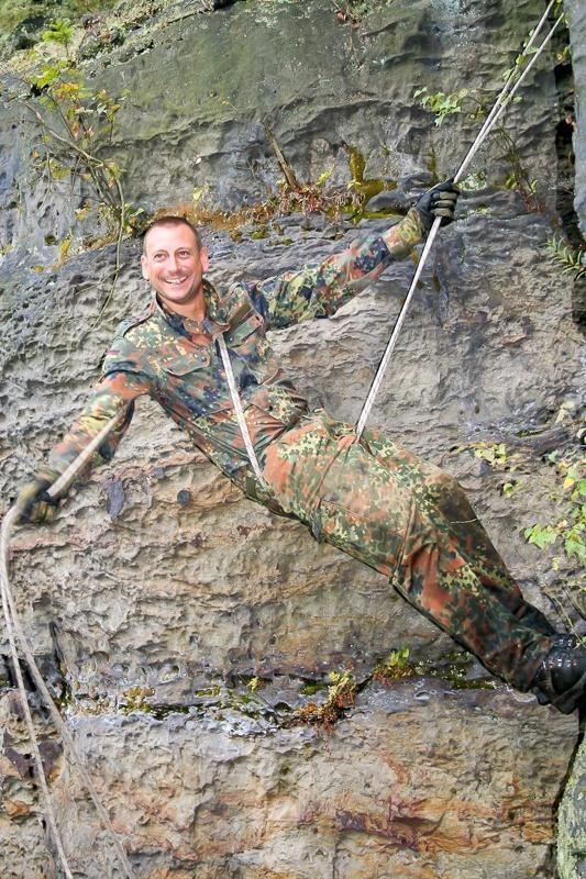 Abseilen an einer Felswand mit Sicherungsseil und Karabiner
