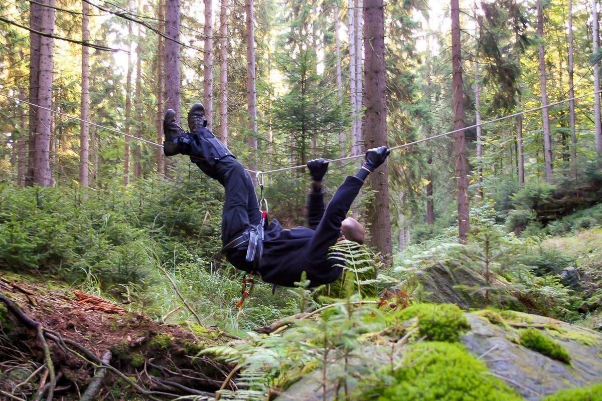 Selbstgebaute Seilquerung wird von einer Person überquert