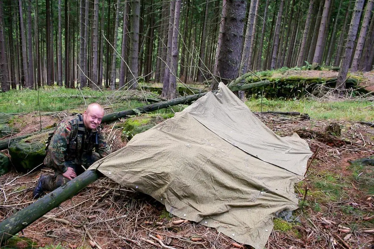 Person sitzt auf einer Tarp-Notunterkunft im Wald und hält einen Gegenstand in der Hand