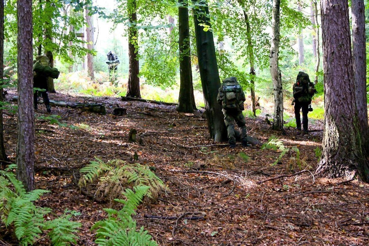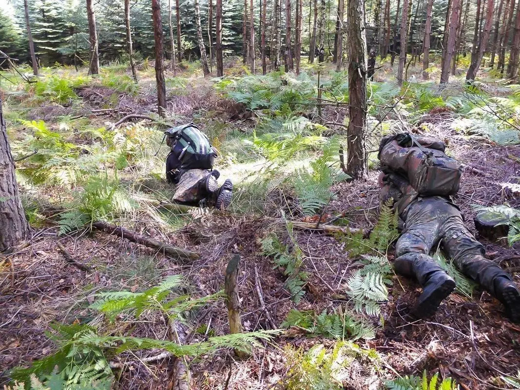 Zwei Personen in Tarnkleidung liegen im Unterholz zwischen Farnen