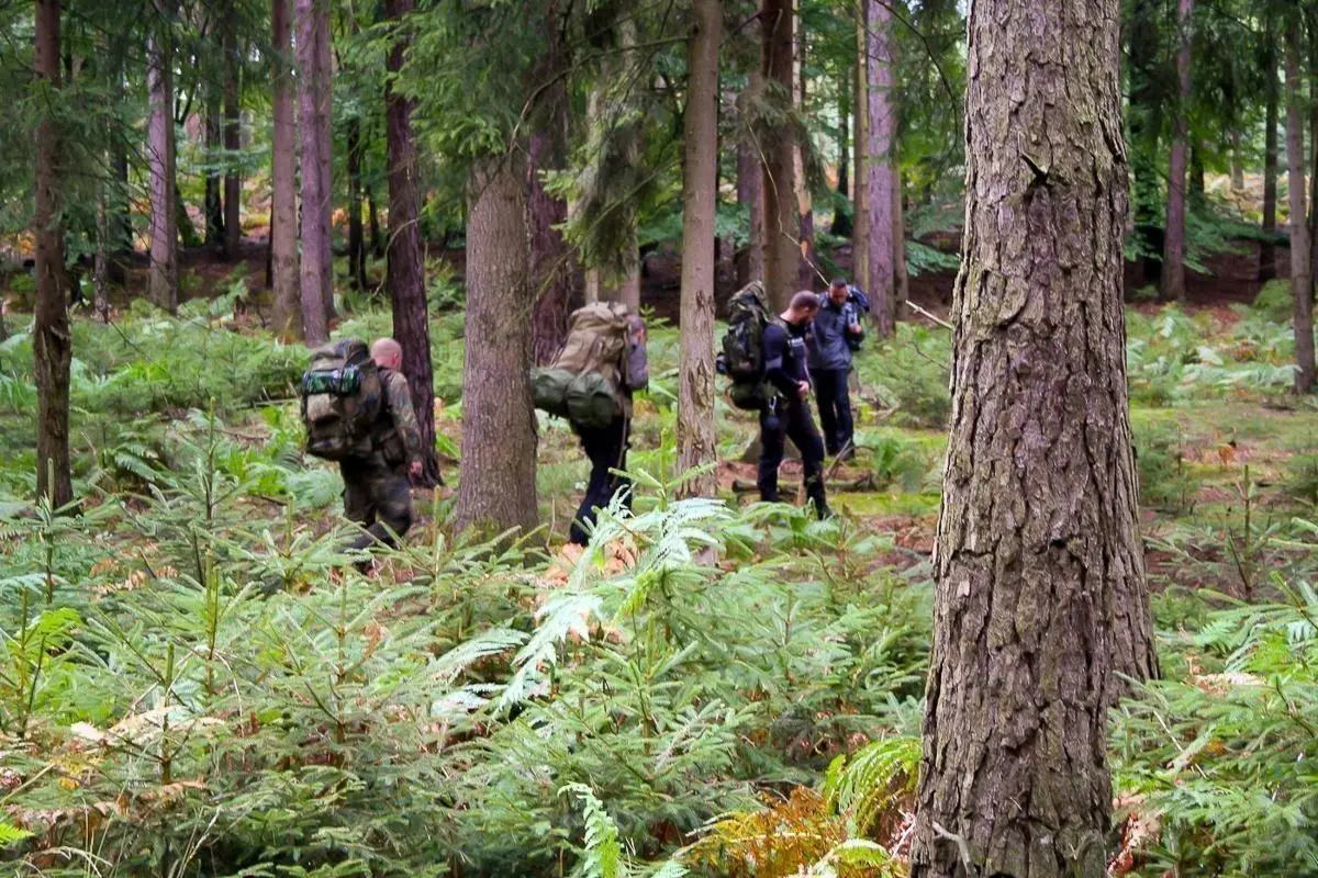 Gruppe mit Rucksäcken steht im Wald zwischen Bäumen