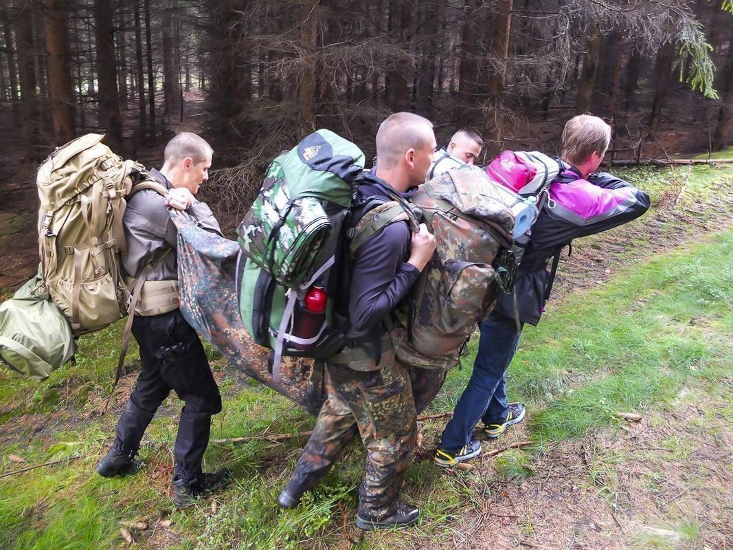 Vier Personen tragen große Rucksäcke und eine Plane durch den Wald