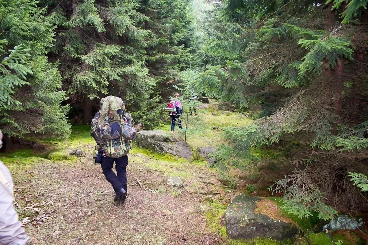 Zwei Personen mit Rucksäcken bewegen sich durch einen bewaldeten Bereich