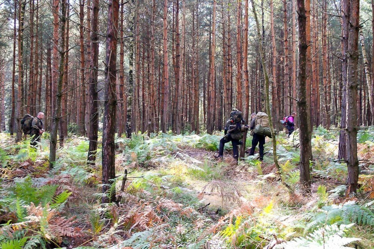 Wanderer mit Rucksäcken bewegen sich durch einen Wald mit Farnen und Kiefern