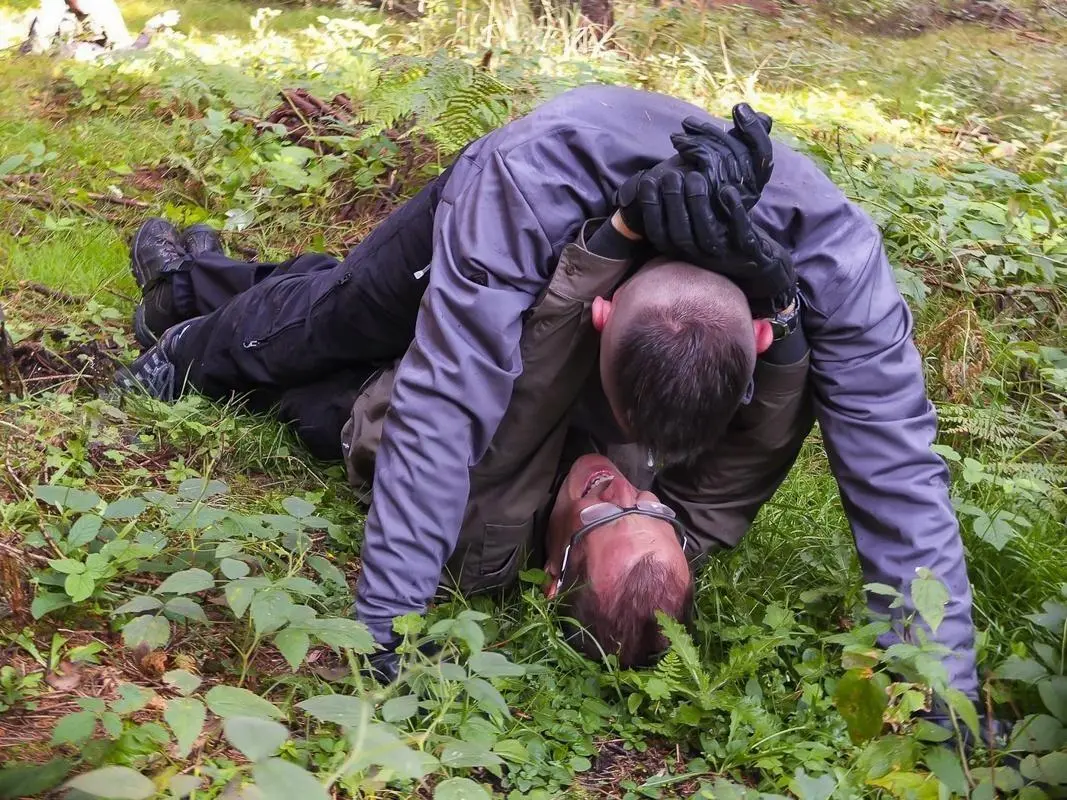 Zwei Personen liegen im Wald auf dem Boden, eine Person hält die andere in einer kontrollierenden Position