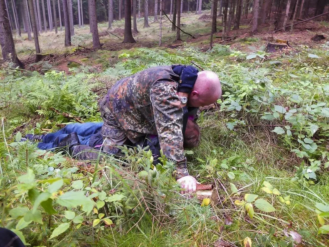 Zwei Personen im Wald, eine Person hält die andere am Boden