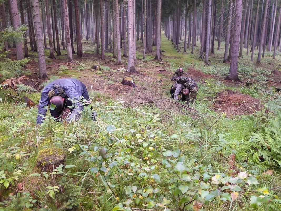 Mann mit Rucksack untersucht den Boden im Wald, während andere zuschauen