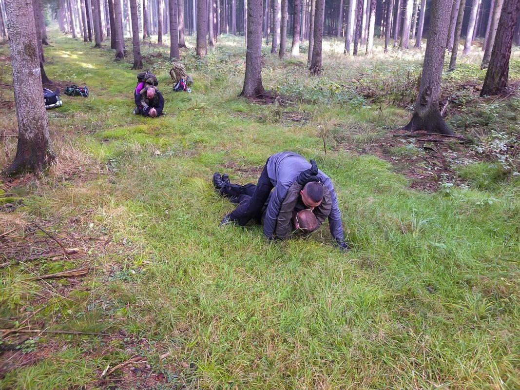 Zwei Personen üben eine Bodentechnik auf Gras im Wald