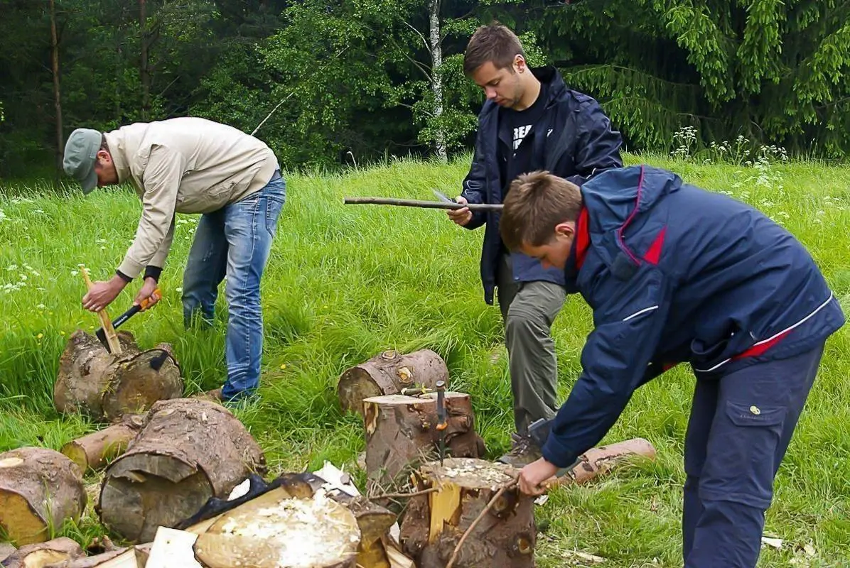 Drei Personen bearbeiten Holzstücke mit Messern und Äxten auf einer Wiese