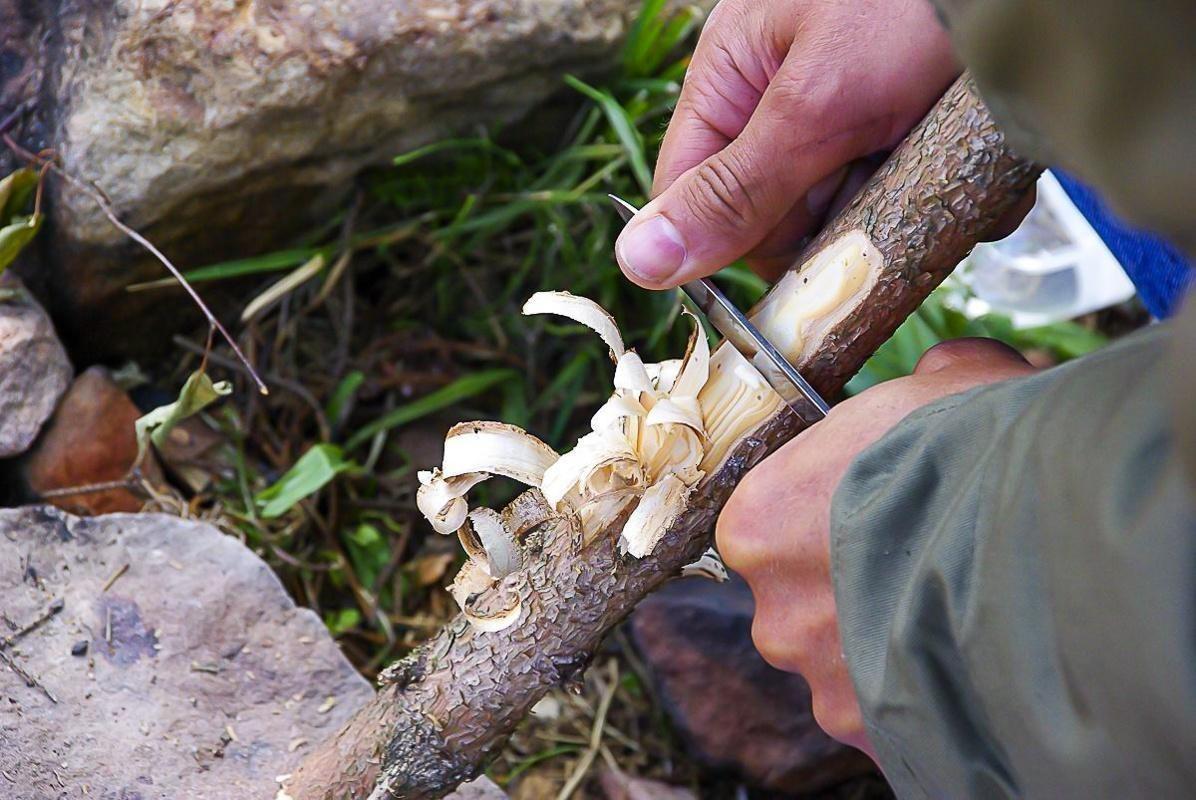 Messer schnitzt Zunder aus einem Holzstück auf einem Baumstumpf
