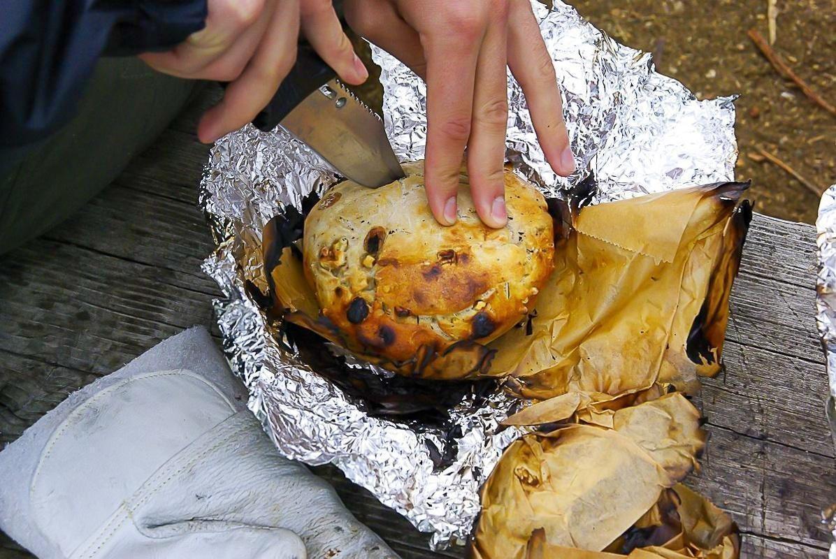 Ein Messer schneidet in ein in Alufolie gewickeltes Brot