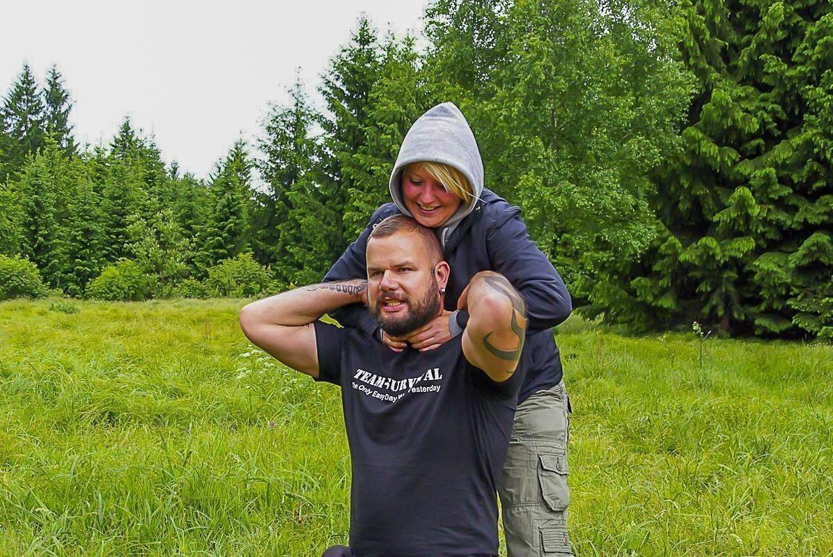 Mann demonstriert Technik mit improvisierter Waffe an Frau im Freien