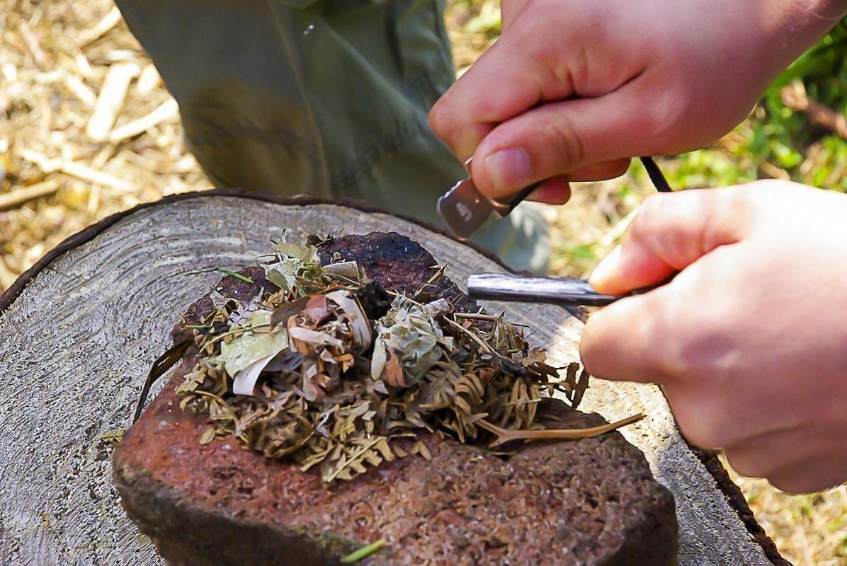 Feuerstahl erzeugt Funken auf Zunder aus Pflanzenmaterial