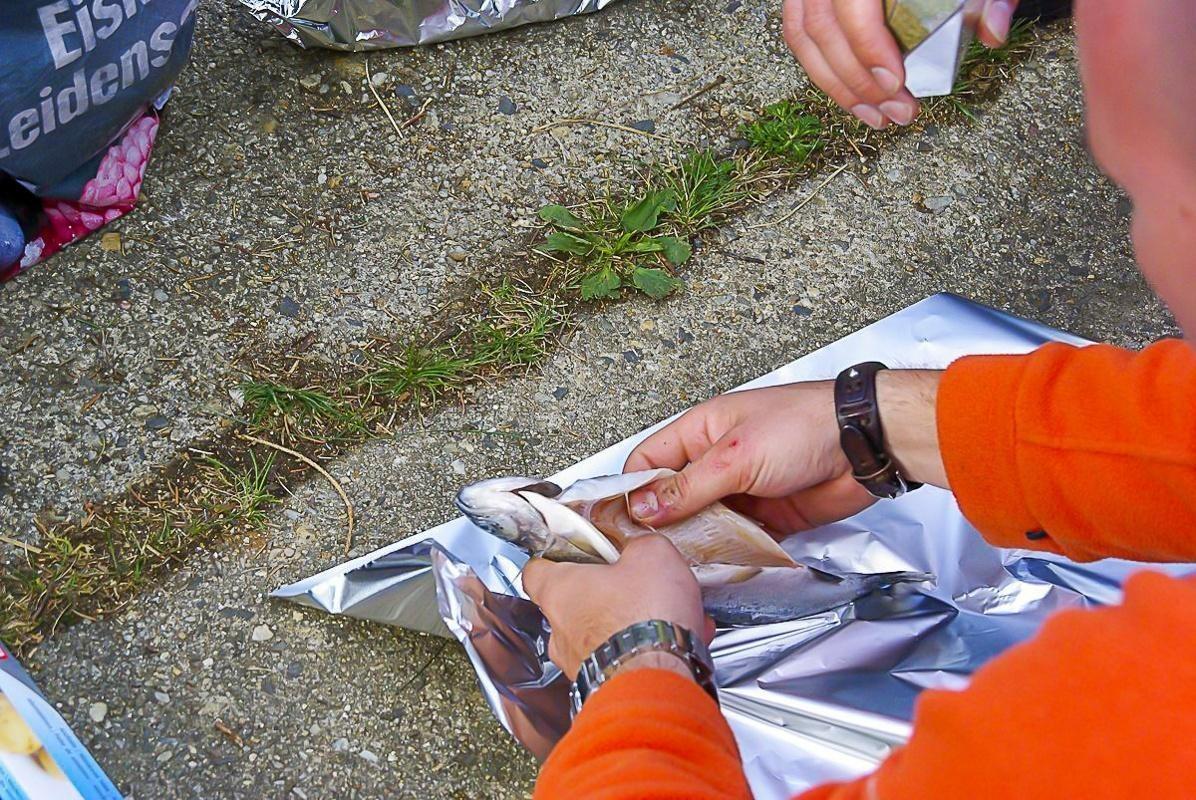 Fisch wird mit Gewürzen präpariert und auf Alufolie gelegt