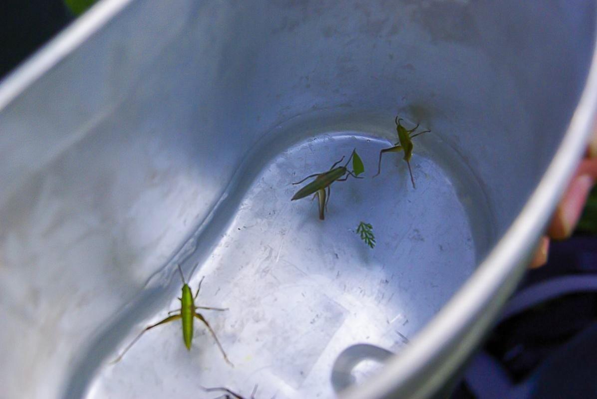 Grüne Insekten und ein Blatt in einem silbernen Behälter