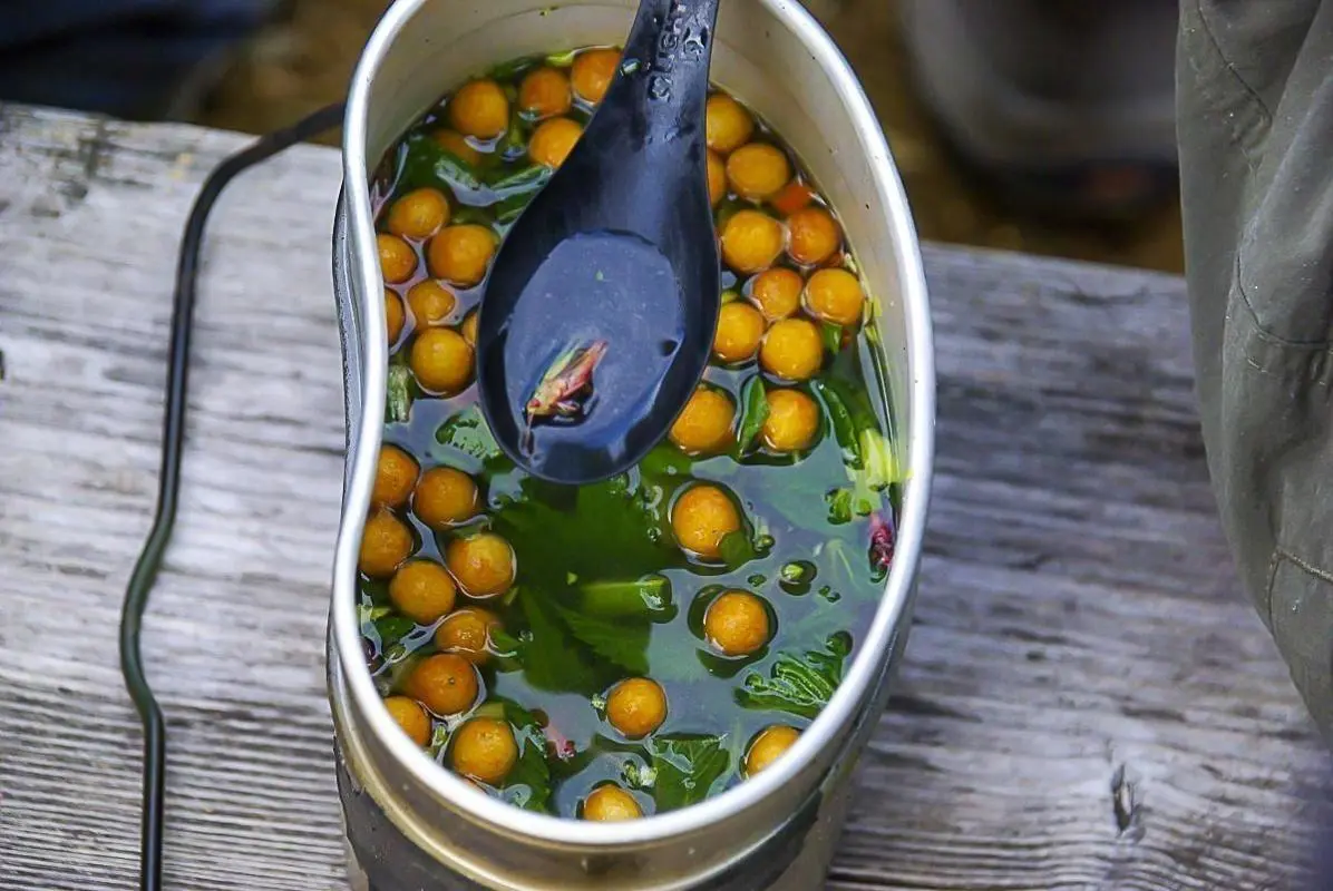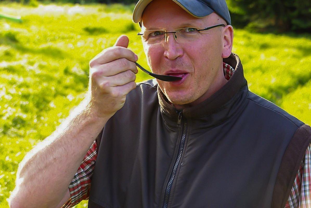 Mann mit Löffel in der Hand kostet eine Speise im Freien