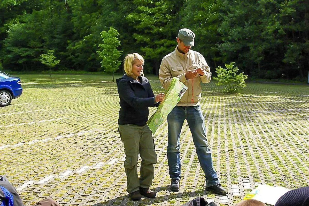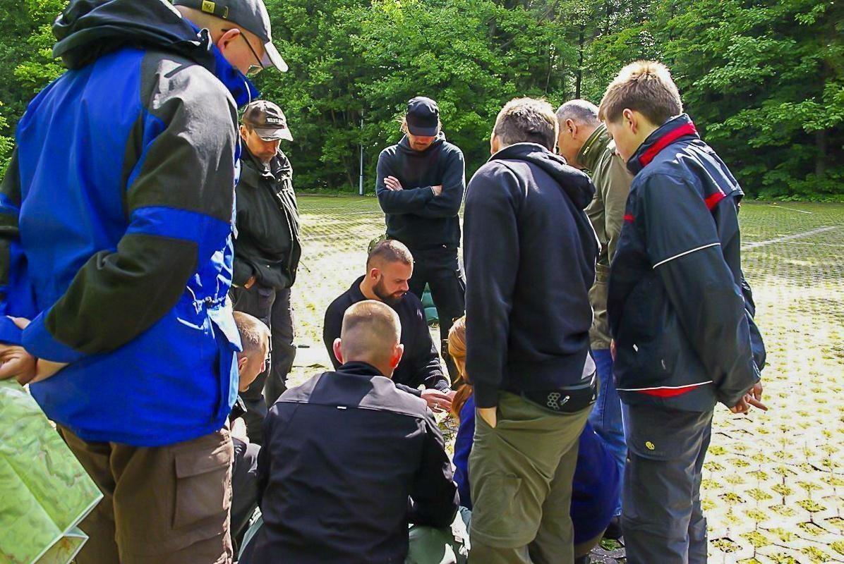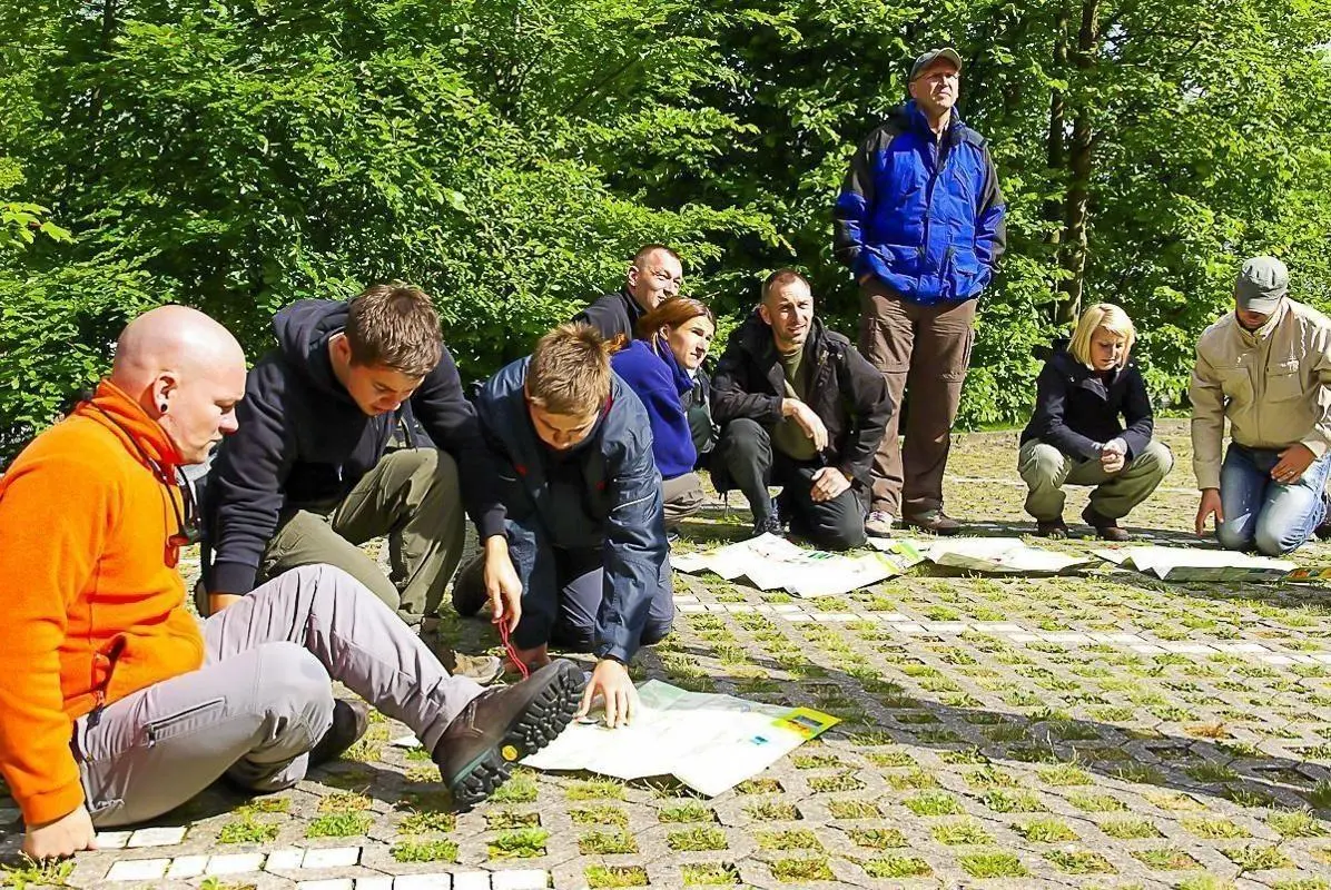 Gruppe diskutiert Karten und Orientierungstechniken im Freien