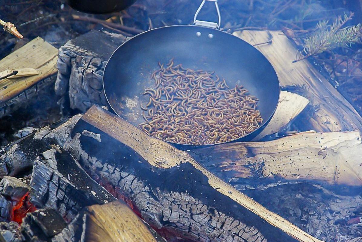 In einer Pfanne werden Insekten über einem offenen Feuer geröstet