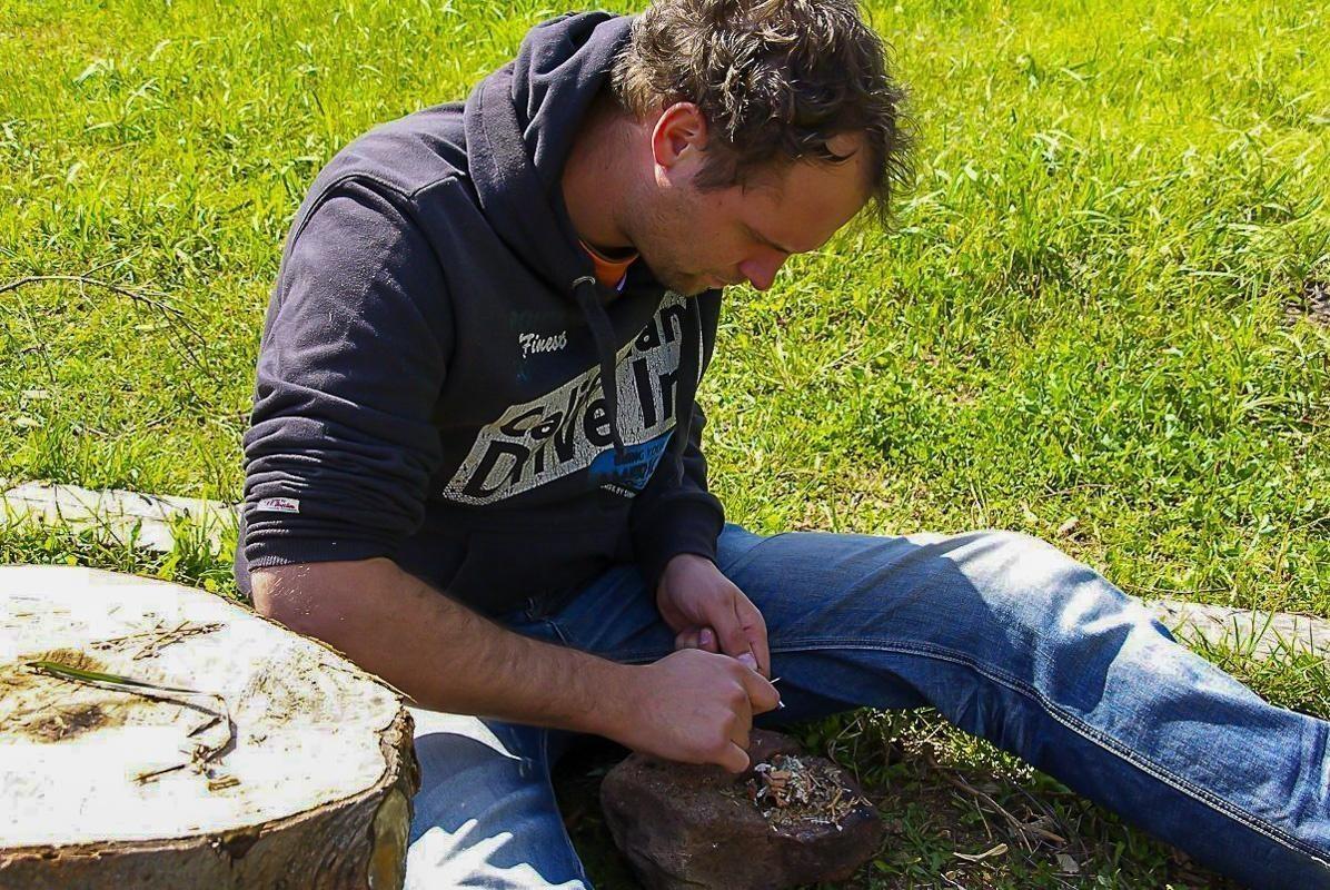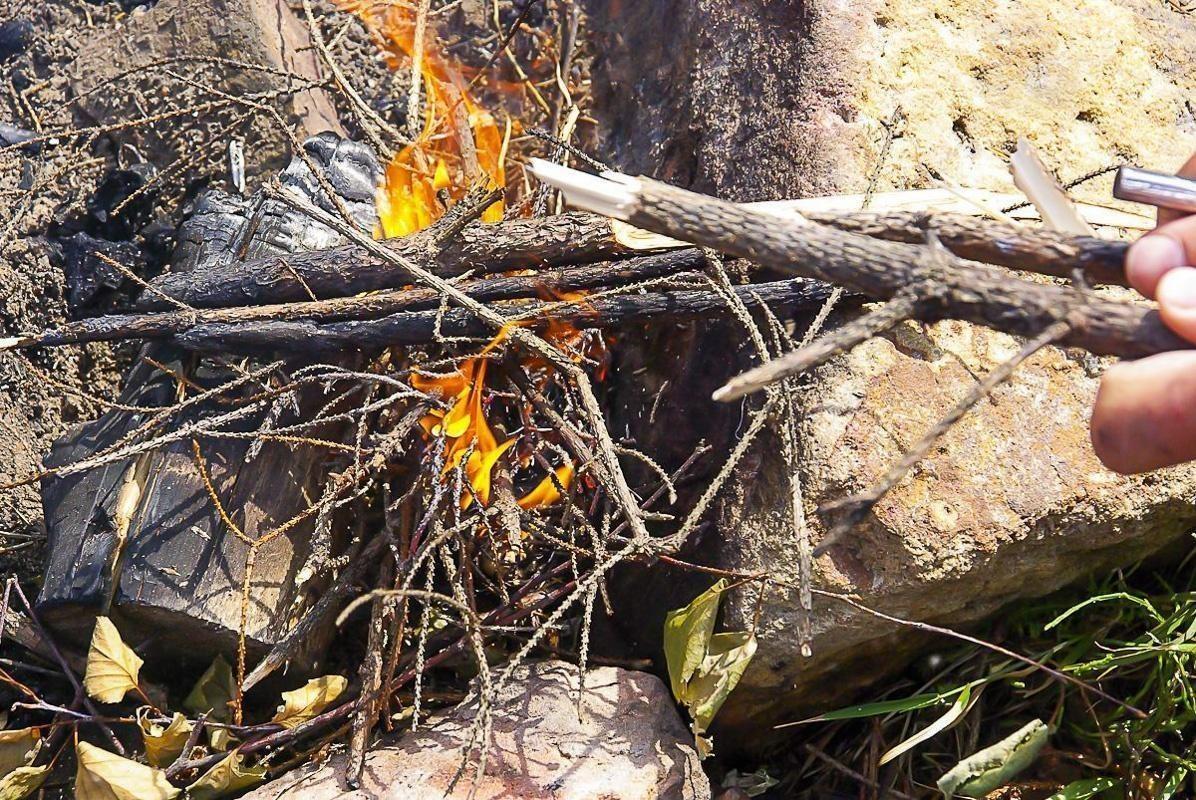 Mann bearbeitet Holzstück mit einem Stock zur Feuererzeugung