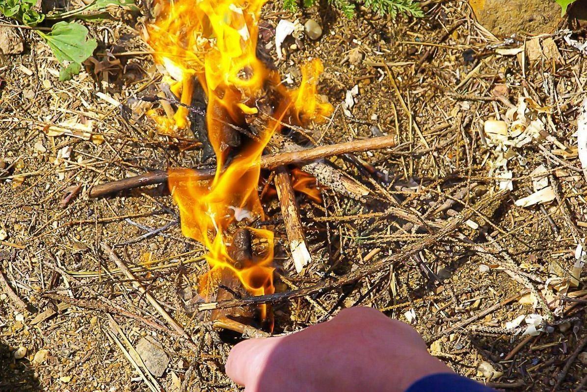 Kleine Flamme auf Holzstück, Person zeigt darauf