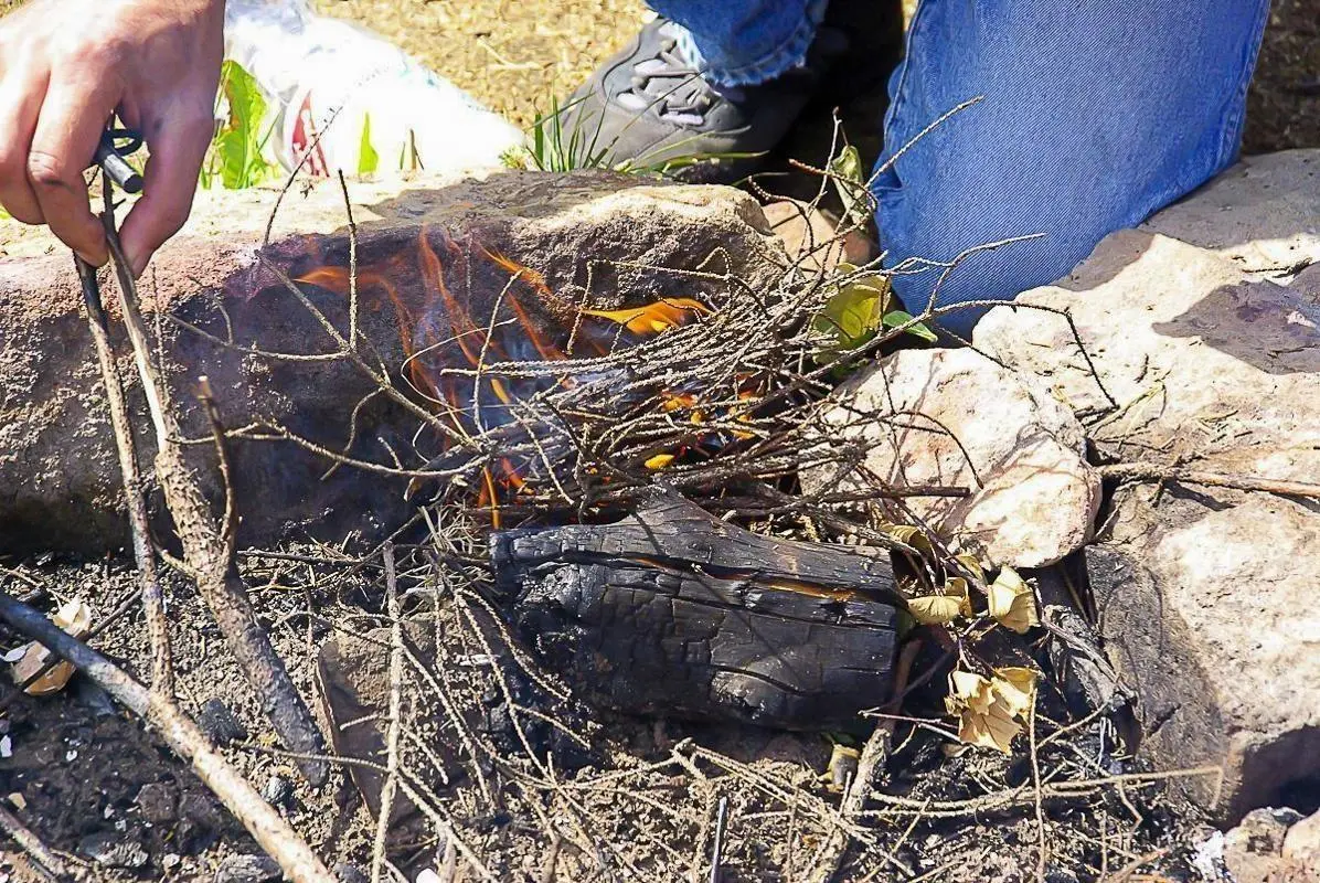 Zunder wird zwischen Steinen vorbereitet, um ein Feuer zu entfachen