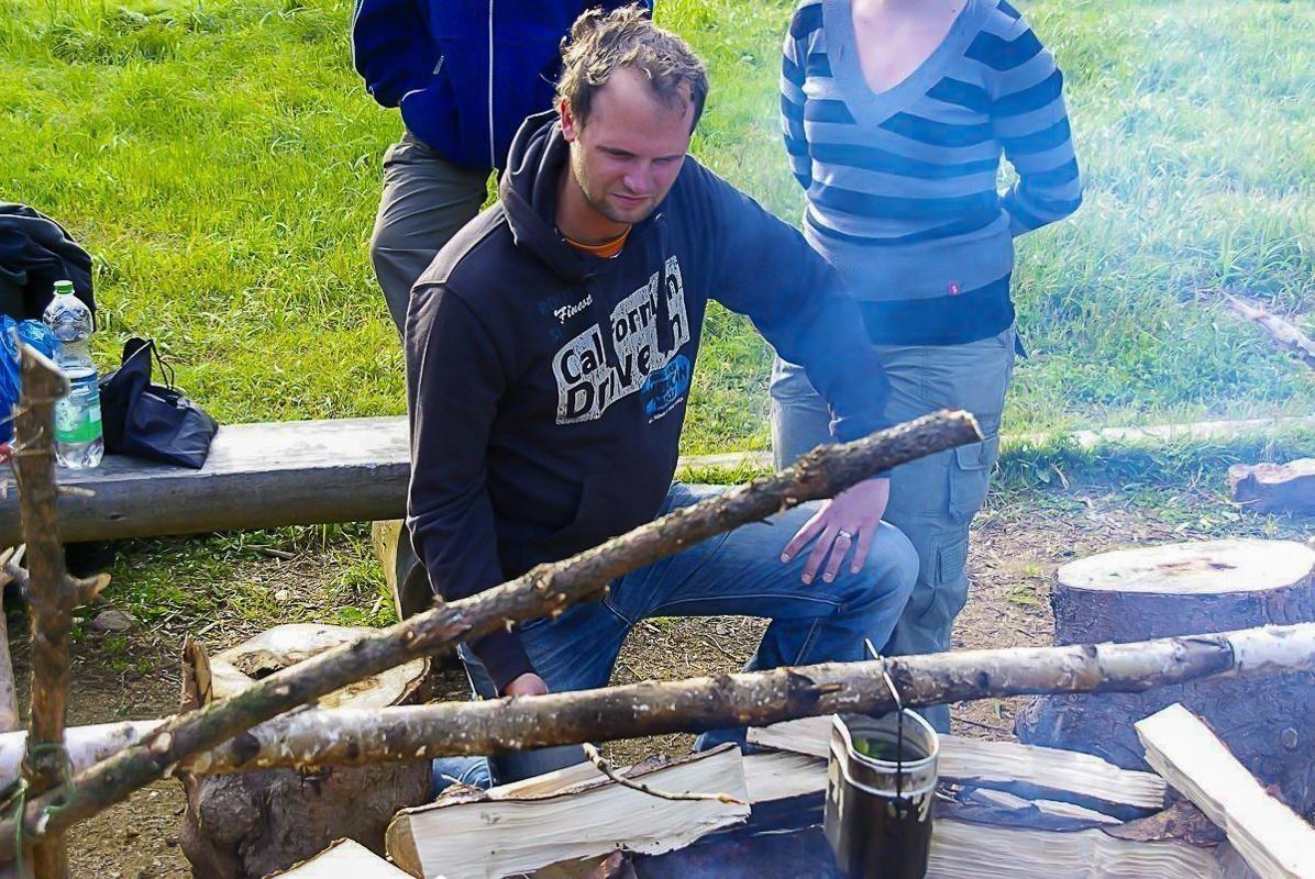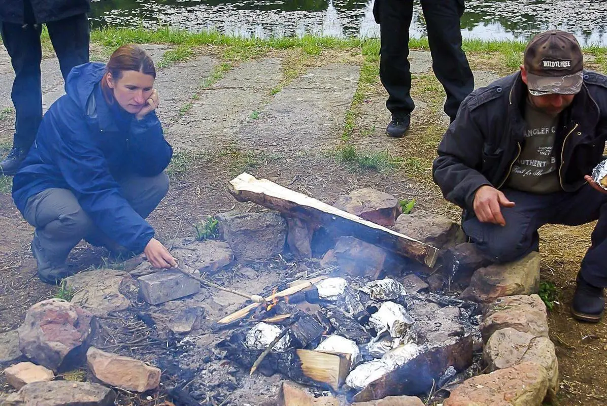 Gruppe arbeitet gemeinsam an einem Feuerplatz mit Holz und Ausrüstung