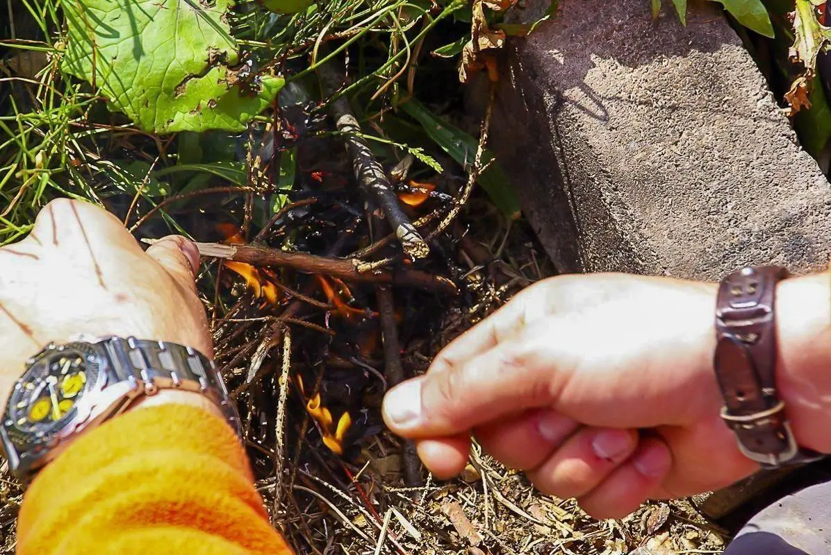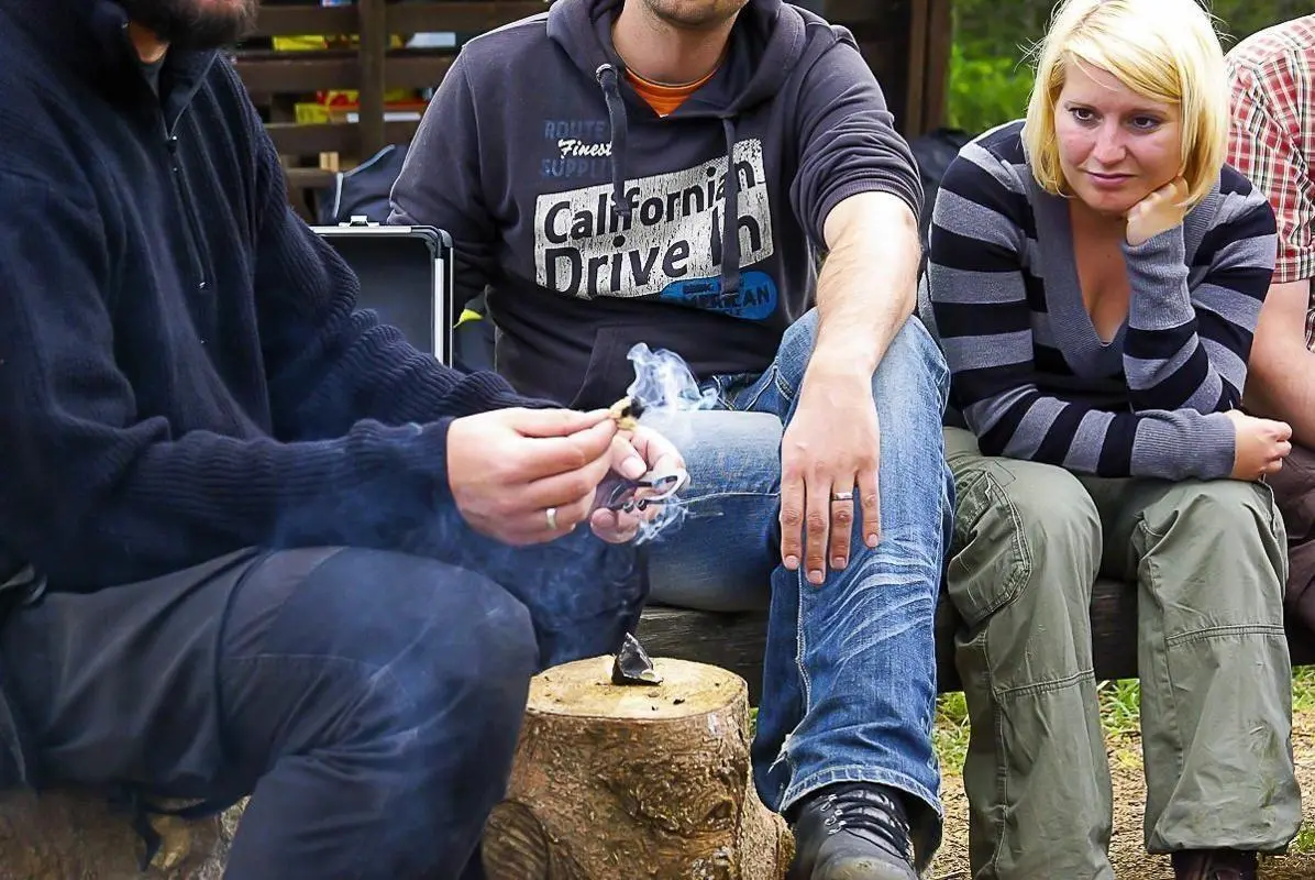 Kleinfeuer raucht auf einem Baumstumpf, während Personen aufmerksam zuschauen