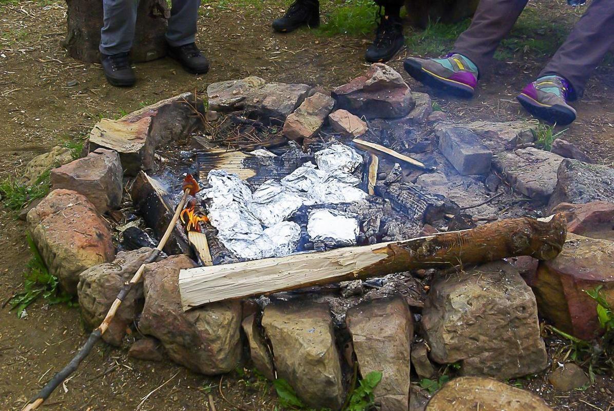 Lagerfeuer mit Steinen umgeben, Teilnehmer sitzen auf Holzstämmen